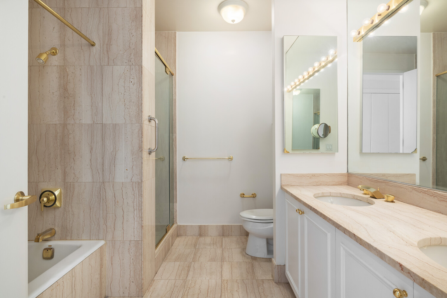 The large and sunny primary bedroom suite overlooks Lincoln Center and is filled with tremendous closet space and custom cabinetry. The ensuite marble bathroom has double sinks along with a separate shower and bathtub. The pleasant secondary bedroom has windows facing north and east and includes an ensuite windowed bathroom as well. (Some photos have been virtually staged.)
