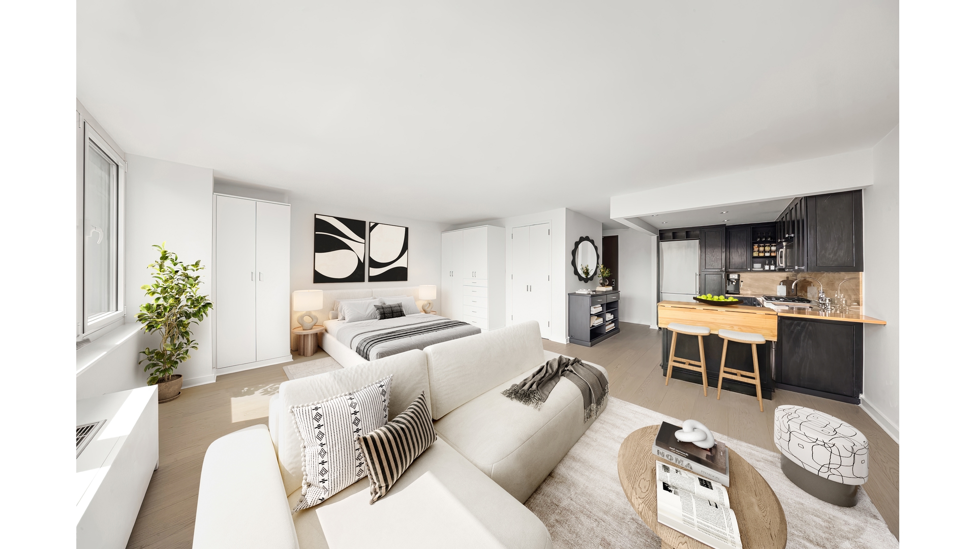 Welcome to Residence 907 at One Rector Park - a high-floor, south-facing studio with Hudson River views, offering bright, refined living in the heart of Battery Park City.