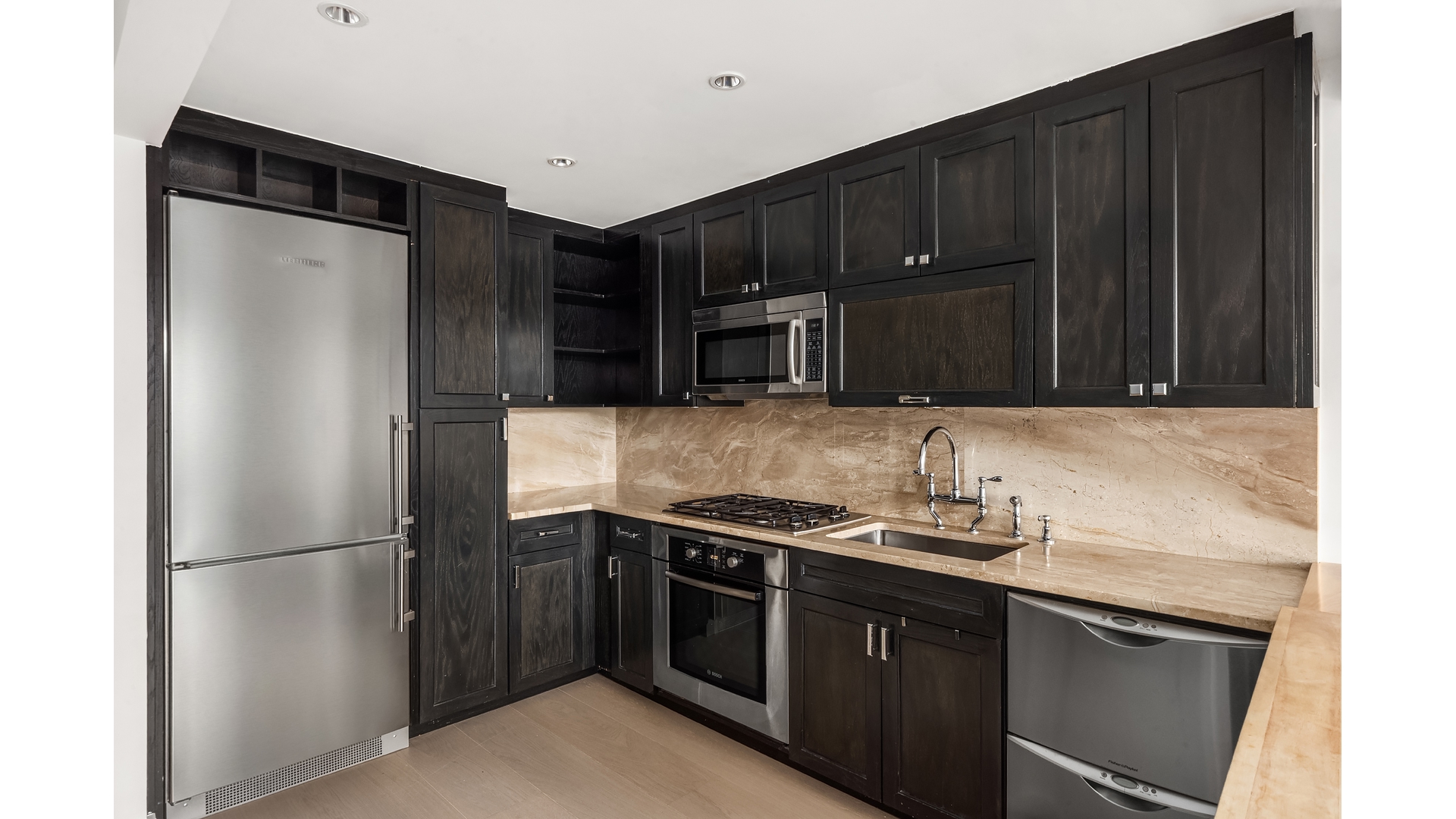 This spacious home features a thoughtfully designed layout with a distinct sleeping area and generous living space. The open kitchen offers excellent storage and room for an island or seating, complemented by stainless steel appliances, including a Liebherr refrigerator, Bosch range, and Fisher & Paykel dishwasher.