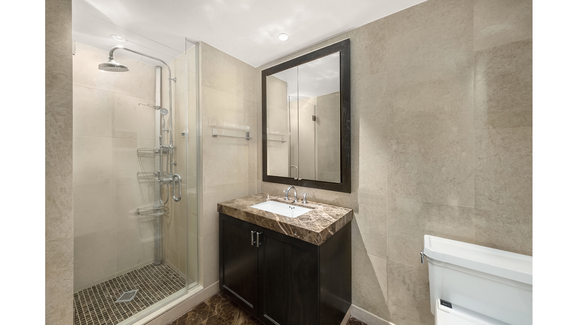 Newly installed 10-inch European White Oak floors run throughout, lending a clean, elevated finish to the home. The oversized bathroom is appointed with a marble vanity and a large stall shower. Additional highlights include custom built-ins and a full-size in-unit washer and dryer.