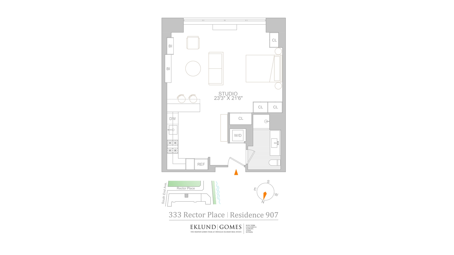 One Rector Park is a full-service condominium with a 24-hour concierge, fitness center, residents' lounge, children's playroom, business center, bike storage, and on-site parking.