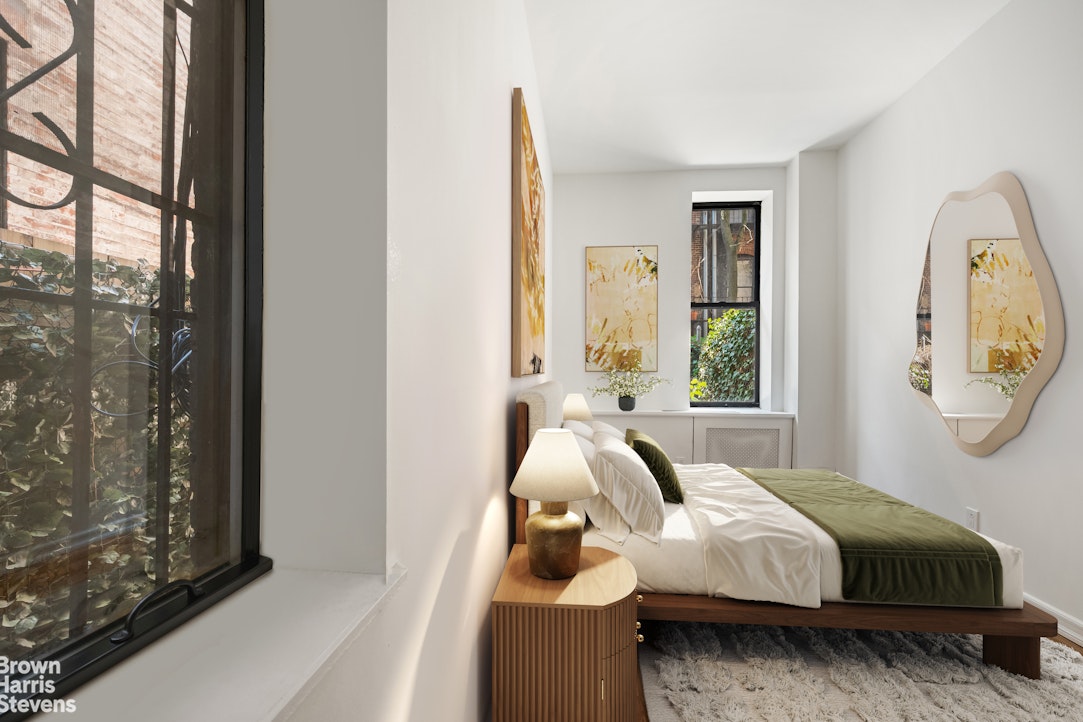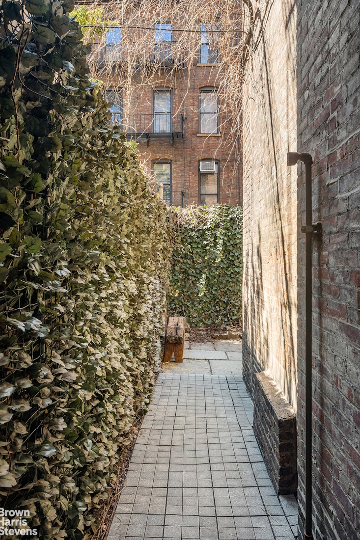 The split layout offers great privacy and separation of space with the primary bedroom with en-suite bathroom and walk-in closet in front, and a bright south-facing second bedroom or home-office with laundry closet in the rear. Generously sized kitchen in the middle features stainless steel appliances and backsplash, commodious cabinetry storage and granite countertops, and a second bathroom comes with a deep-soaking tub. The comfortable living room provides direct access to a true urban retreat, your own sunny and secluded backyard! This home effortlessly combines historic charm with contemporary comfort, offering the quintessential New York City living experience.