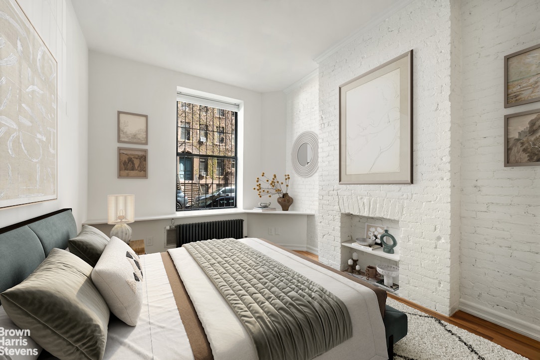 • Wonderfully affordable two-bedroom apartment with two full bathrooms and a private backyard, perfectly situated in the vibrant heart of Hell's Kitchen. This spacious floor-through unit features charming pre-war details including high ceilings, re-finished hardwood floors, decorative fireplaces and a beautifully painted exposed brick wall running the length of the apartment. All for under $1 million!