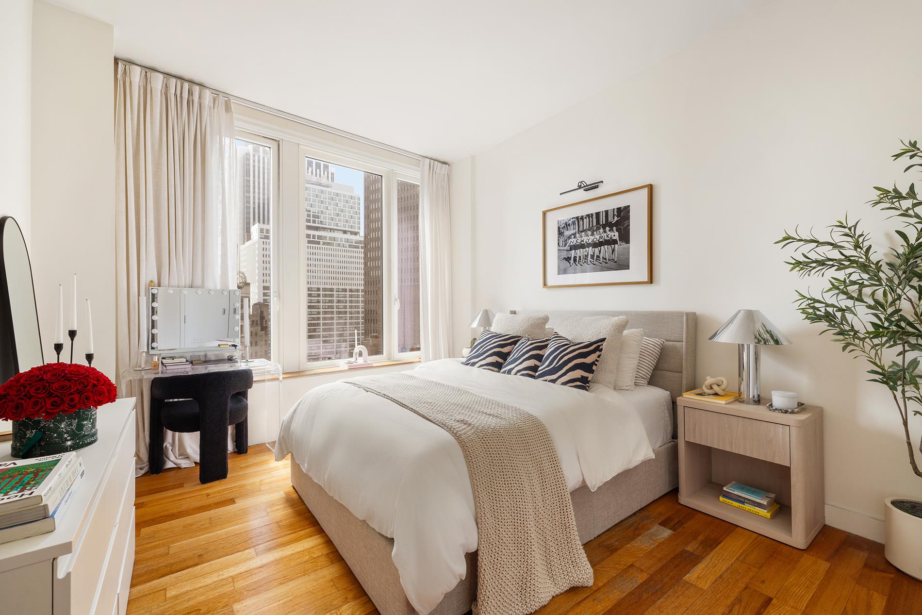 This corner residence boasts floor-to-ceiling windows and soaring ceilings, flooding the home with natural light and offering sweeping city views. The open-plan living and dining area is ideal for entertaining, with a chef’s kitchen featuring custom cabinetry, Caesarstone countertops, and top-of-the-line appliances by Miele, Gaggenau, and Sub-Zero.
