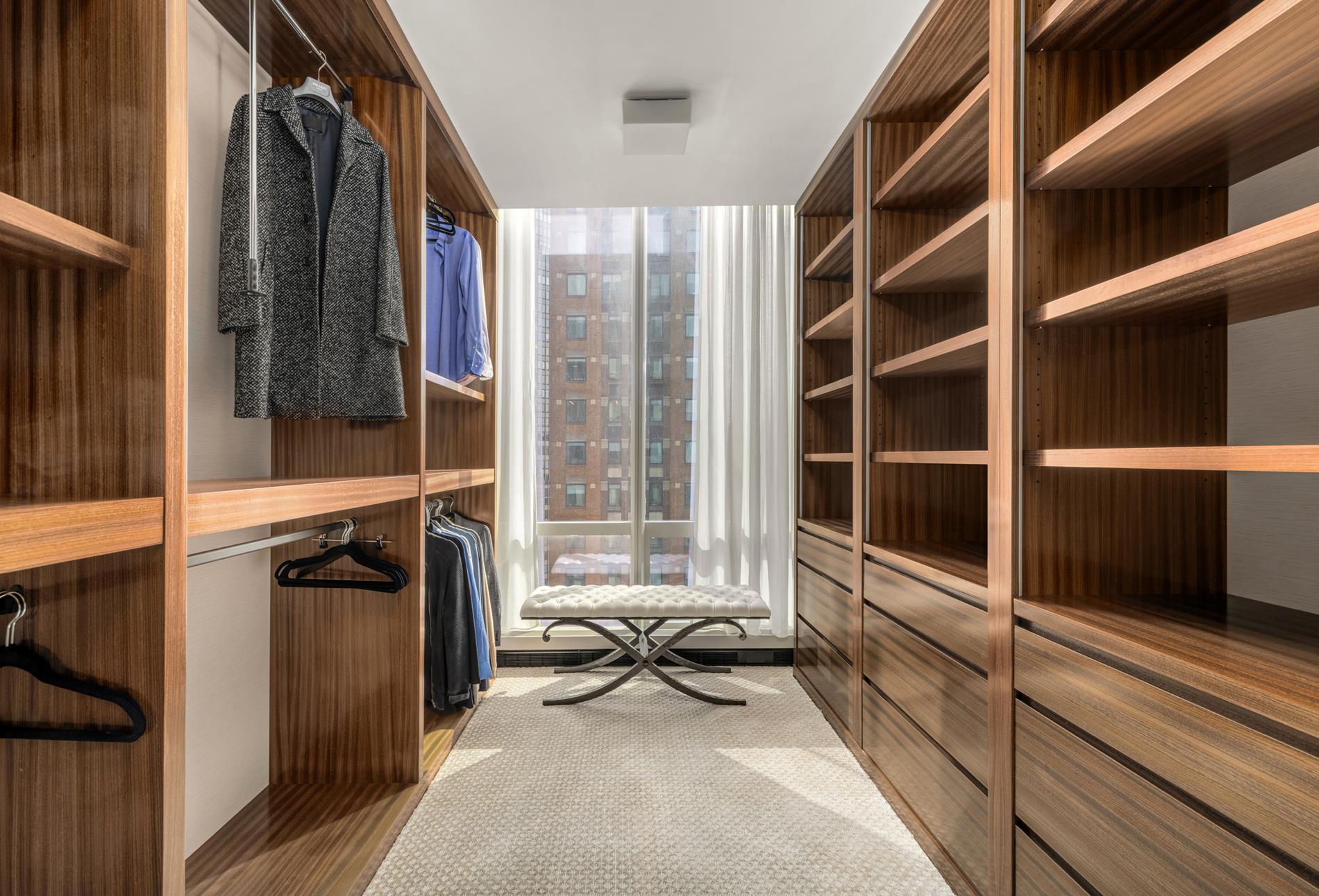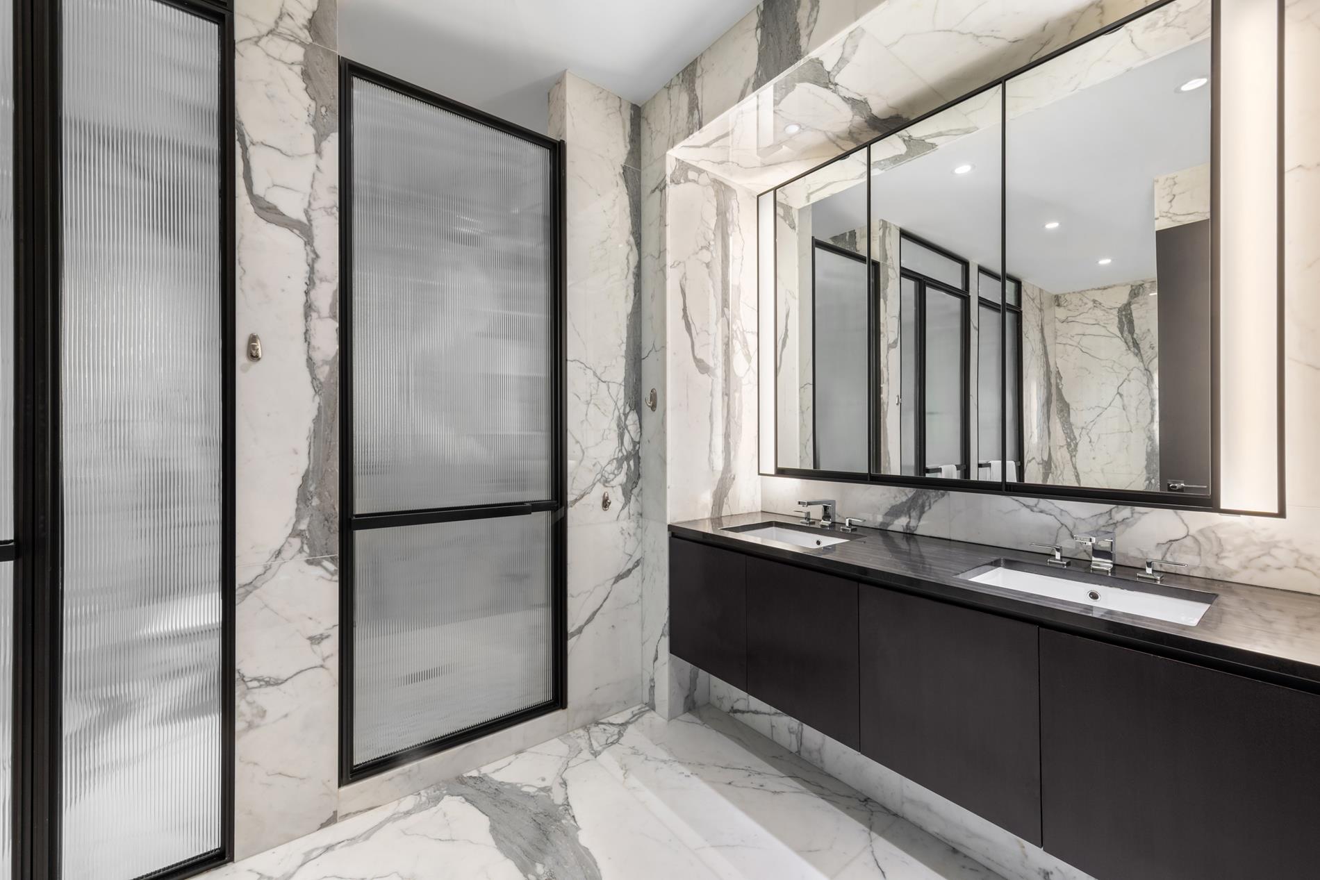 Occupying 1,200 square feet as well as the southwest wing of this spectacular home, the palatial primary suite boasts stunning city skyline and Hudson River views, as well as a large, windowed dressing room and a private study with views over Central Park. The marble clad ensuite bathroom features discreet double WCs, a large soaking tub and a separate shower. Four additional bedroom suites feature generous proportions and ensuites with custom millwork and Dornbracht nickel fixtures.