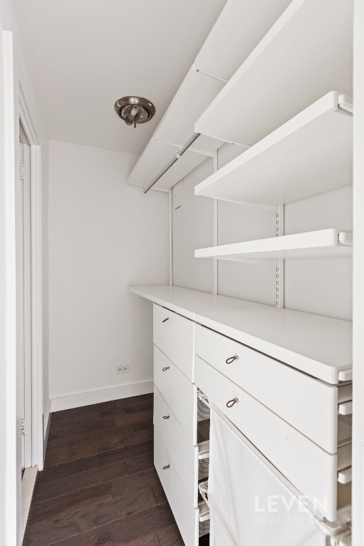 The kitchen has been intelligently reconfigured to maximize both storage and usability, featuring recessed lighting, expanded stone countertops, abundant cabinetry, and stainless steel appliances including a dishwasher and wine chiller. Tucked away from the main living area, the sleeping alcove offers welcome separation and comfortably accommodates a setup that includes bedside furniture. Storage is exceptionally well considered, with a fully outfitted walk-in closet adjacent to the bath, an additional double closet in the foyer, and a bath equipped with a full-sized tub, medicine cabinet storage, and under-sink cabinetry.