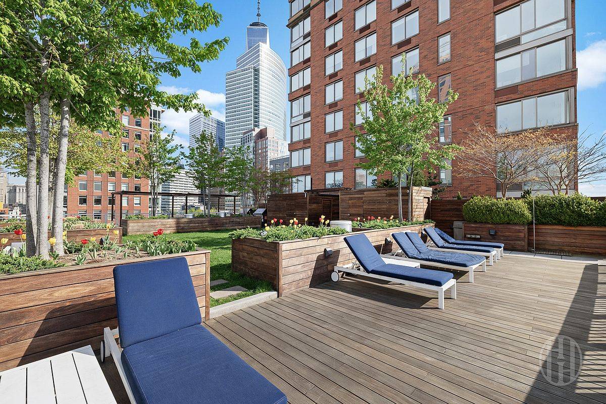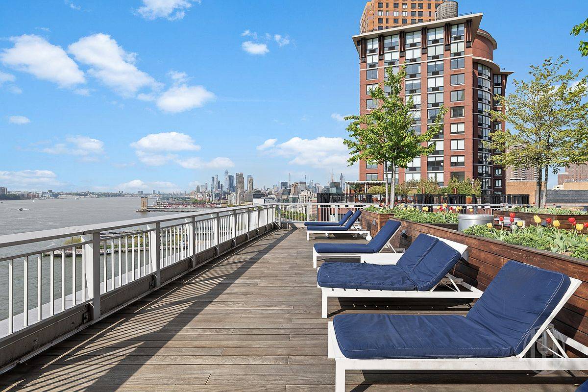 24-hour notice required for appointments (tenant in place). Welcome to Residence 5N at River & Warren, a thoughtfully designed split two-bedroom, two-bathroom home in one of Battery Park City's most coveted full-service condominiums. Spanning 1,061 square feet, this east-facing residence is bathed in morning light and looks out over the lush canopy of Teardrop Park. The N-line is among the building's most sought-after layouts, prized for its efficient flow and seamless balance of living and entertaining space. A separate private storage unit on the same floor conveys with the apartment, a rare and valuable convenience in a building of this caliber. A gracious entry gallery opens into an expansive living and dining area, where oversized windows frame serene park views. The open chef's kitchen is anchored by custom European cabinetry with white oak accents, elegant stone countertops, and a full suite of top-tier appliances, including a Sub-Zero refrigerator and Miele gas cooktop, oven, speed oven, and dishwasher. It is a kitchen built for everyday ease and effortless entertaining. The primary suite is a tranquil retreat with generous closet space and a spa-inspired marble bath featuring chevron-patterned floors, a custom white oak double vanity, a deep soaking tub, and a separate glass-enclosed shower. The second bedroom is well-proportioned and sits adjacent to a second full bath finished with high-end fixtures and its own soaking tub. Throughout the home, 5-inch wide-plank oak flooring, a Bosch washer/dryer, abundant storage, and refined finishes lend a modern, livable elegance. Designed by the renowned CetraRuddy, River & Warren is a white-glove condominium in strong financial standing, offering a full-time doorman, concierge, live-in superintendent, state-of-the-art fitness center with a dedicated yoga room, children's playroom, and a landscaped rooftop terrace with grills and panoramic Hudson River views. Steps from Teardrop and Rockefeller Parks and minutes from Tribeca, Brookfield Place, and Whole Foods, with the A, C, E, 1, 2, 3, PATH, and Ferry lines all nearby, Residence 5N delivers the best of downtown New York in a peaceful, park-side setting.