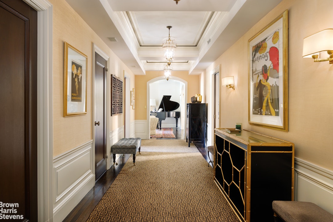 A semi-private elevator landing opens into an inviting entrance foyer and elegant central gallery, setting the tone for the residence's timeless sophistication. Graceful arched doorways, exquisite crown moldings and beams, and classic prewar details create a stunning ambiance throughout.