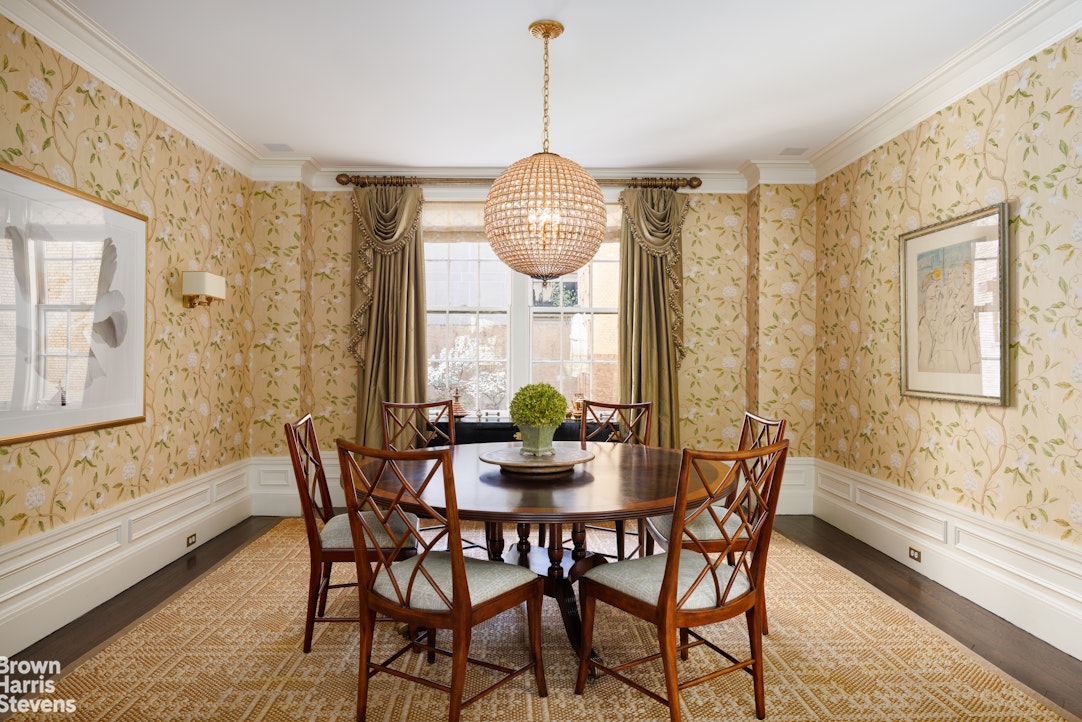 The grandly proportioned living room is bathed in natural light from both eastern and western exposures and features a wood-burning fireplace with a beautifully restored marble mantel. Flowing seamlessly into the adjacent dining room, the two spaces combine to create more than 40 feet of gracious entertaining space with views to Park Avenue in one direction and views to the planted gardens of 655 Park Avenue in the other direction!