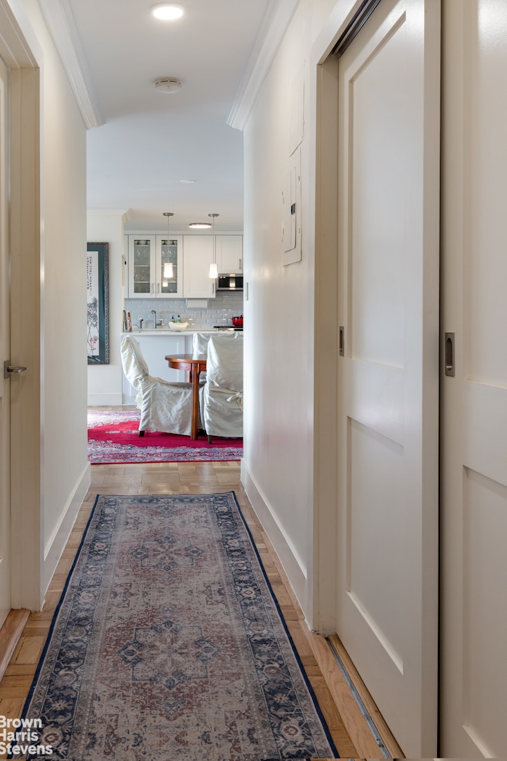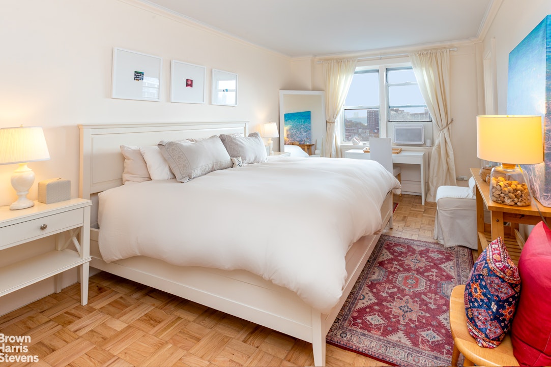 The private bedroom wing features a serene primary bedroom with a renovated, windowed en-suite half bath and a generous walk-in closet. The second bedroom is well-sized and beautifully appointed. The full bathroom is elegantly finished with Carrara marble floors and walls, a Rohl/Riobel rain shower system, a Toto toilet with a Washlet bidet seat, and a Kohler Verdera mirrored medicine cabinet.