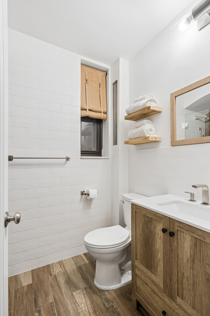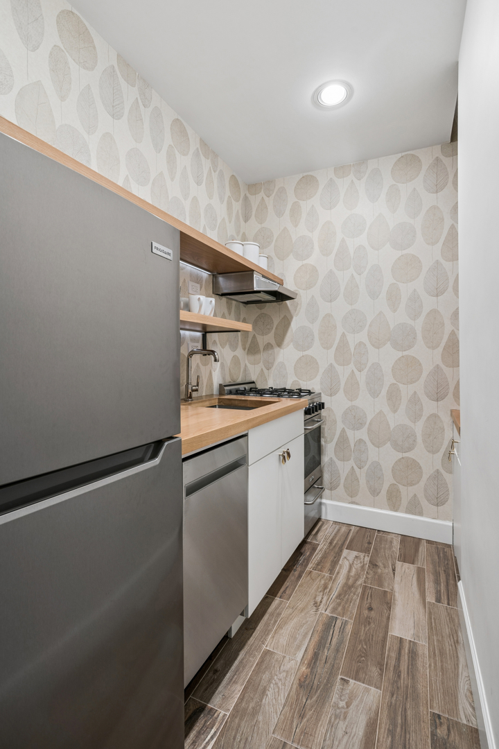 The renovated, windowed kitchen is outfitted with stainless steel appliances, including a dishwasher. The bathroom showcases a timeless Art Deco design, complete with classic tiled finishes, an arched shower, and Kohler fixtures. As an added bonus, the apartment includes a spacious 5x5 private storage cage within the building at no additional cost.
