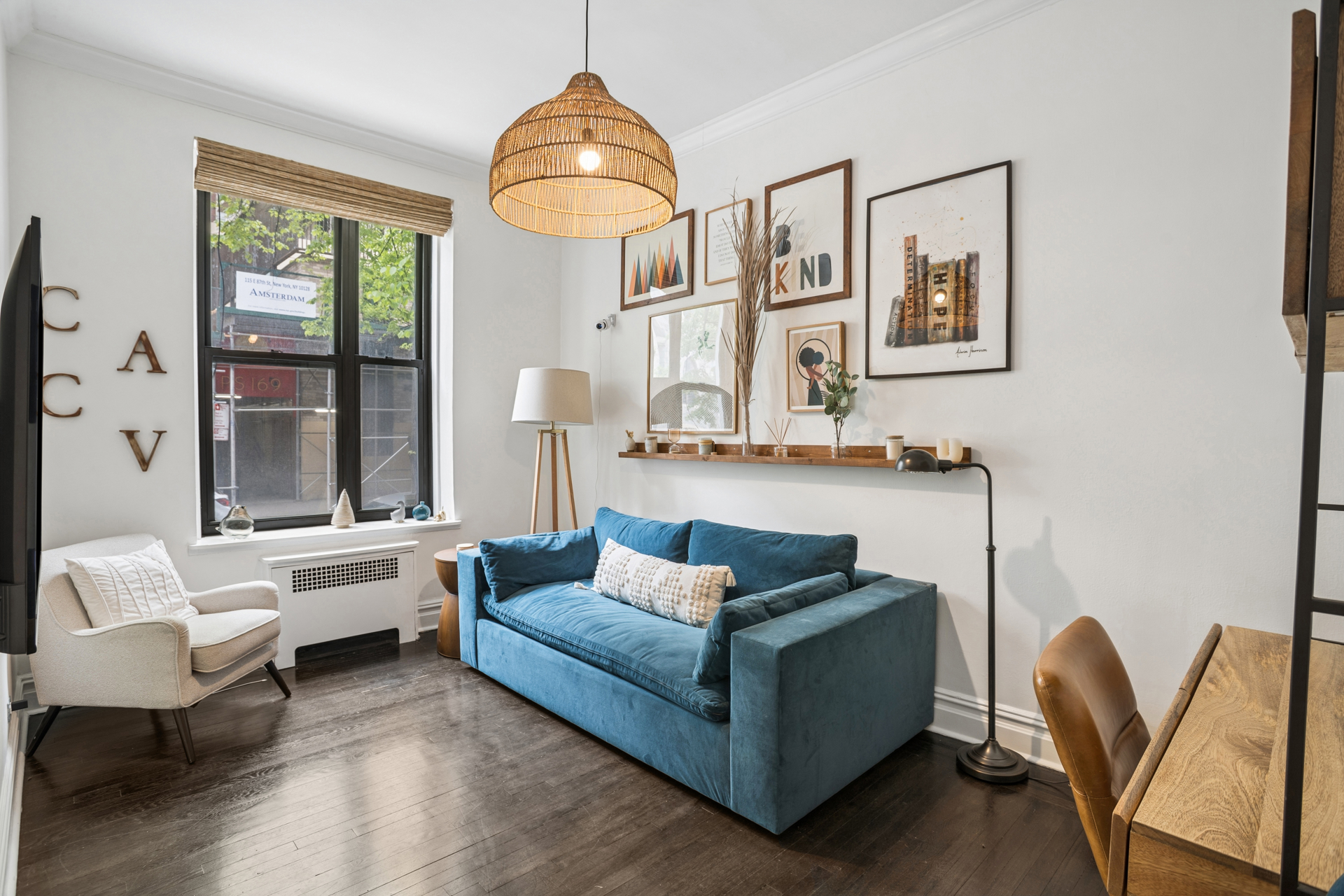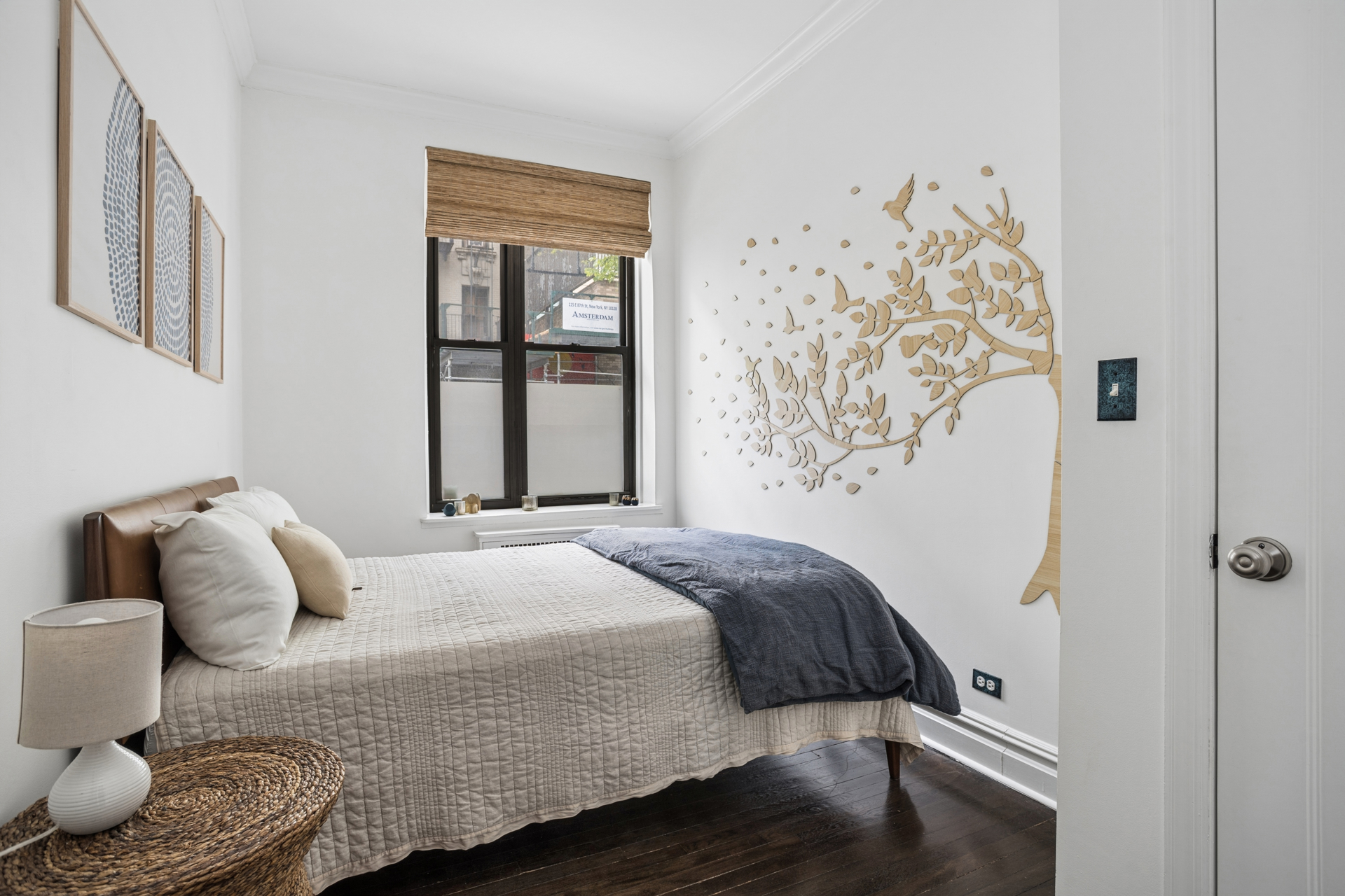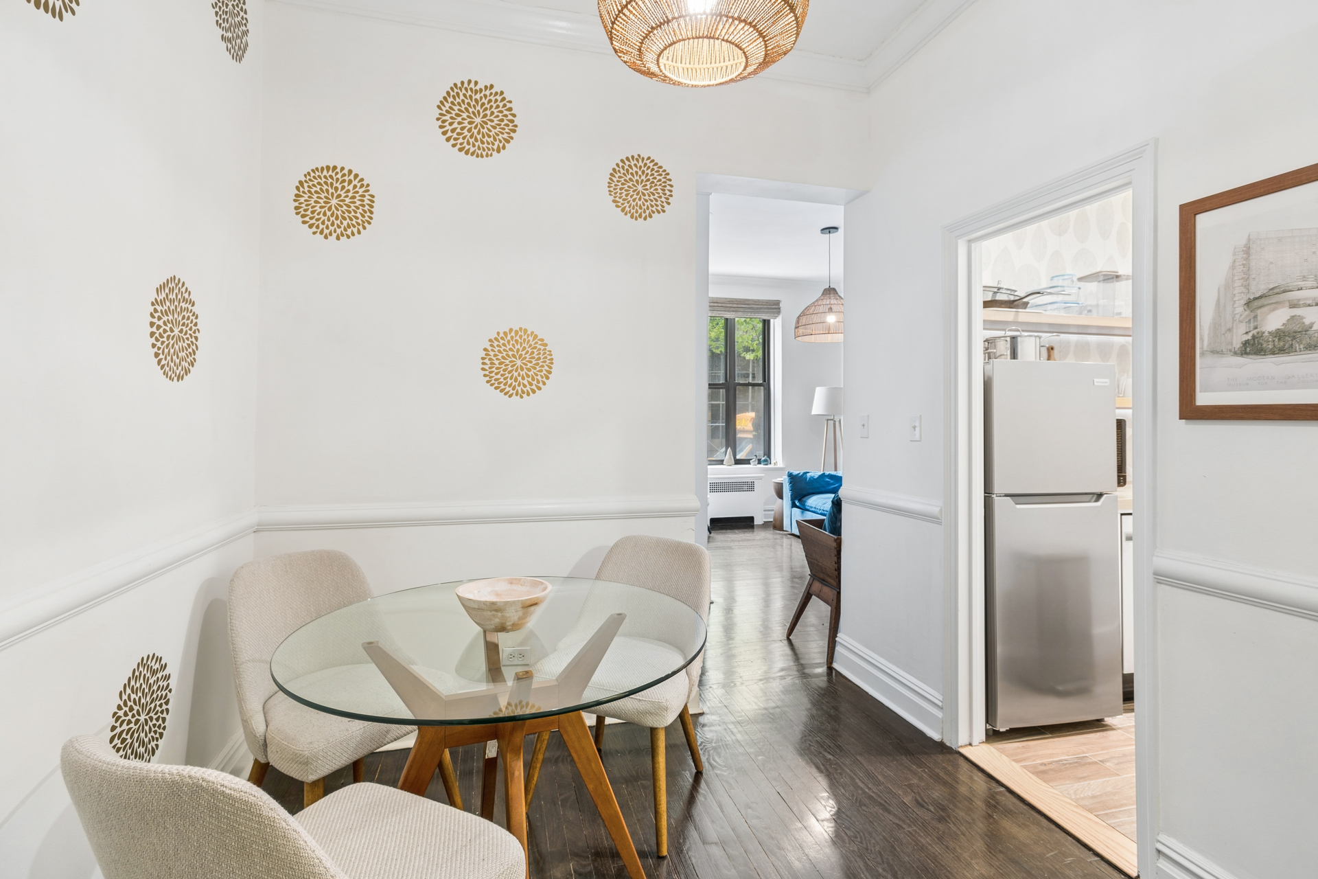 A convenient elevated parlor-level entrance welcomes you into this charming Carnegie Hill gem. The home features soaring 10-foot ceilings, elegant crown moldings, rich hardwood floors, and oversized south-facing windows that frame leafy views over East 88th Street. A gracious entry foyer easily accommodates a dining area and flows seamlessly into the living room.