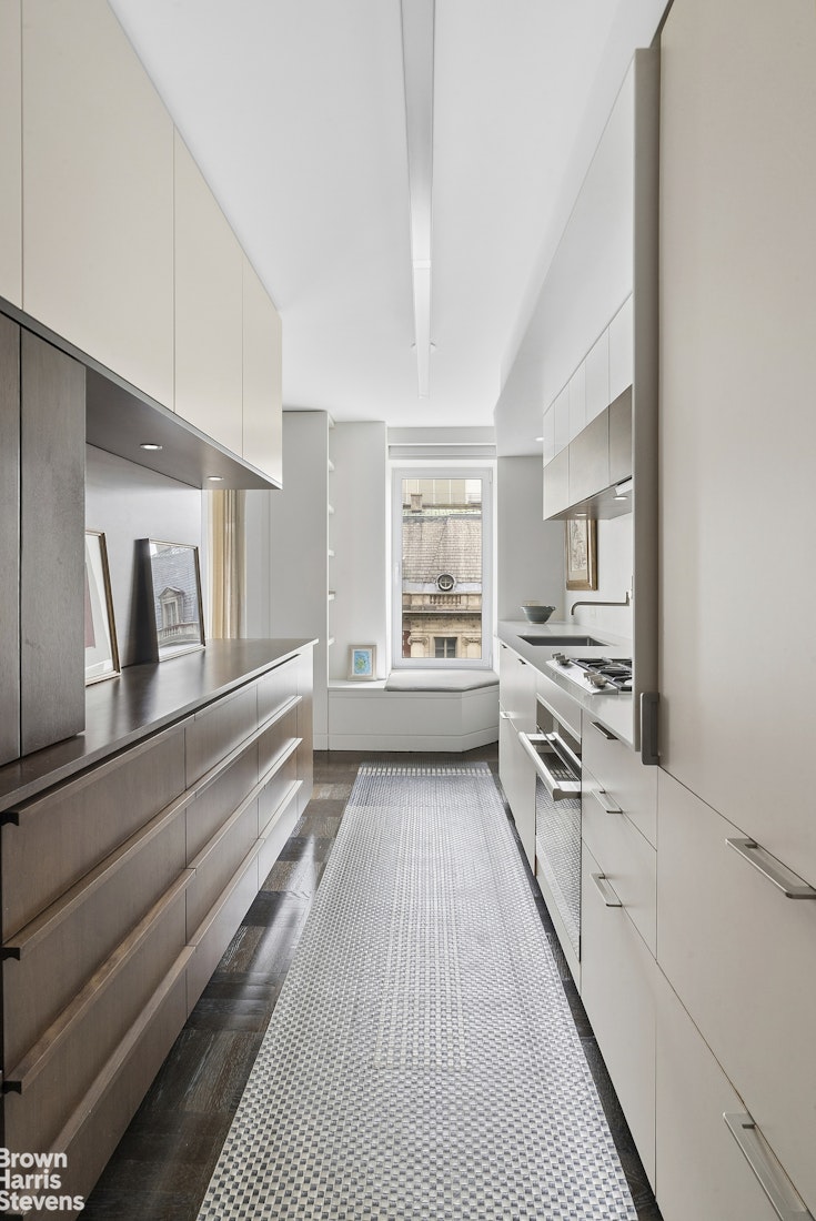 The windowed kitchen is a masterclass in both form and function, appointed with sleek Corian countertops and backsplash, bespoke walnut cabinetry & abundant storage. Premium appliances include a Gaggenau range,Miele dishwasher & Sub-Zero refrigerator with dual freezers, complemented by a separate pantry closet-perfectly suited for seamless daily living & effortless entertaining.