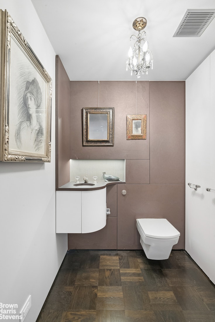 A private hallway leads to the serene primary suite, which may be discreetly enclosed by a concealed door for heightened privacy. This tranquil retreat features custom built-ins with elegant sliding art panels, ample closet space & a dedicated study area with a beautiful view of Central Park & the surrounding skyline. The en-suite marble bath is a sanctuary in its own right, showcasing a Japanese tiled accent wall, an exquisite walk-in shower & three additional closets.