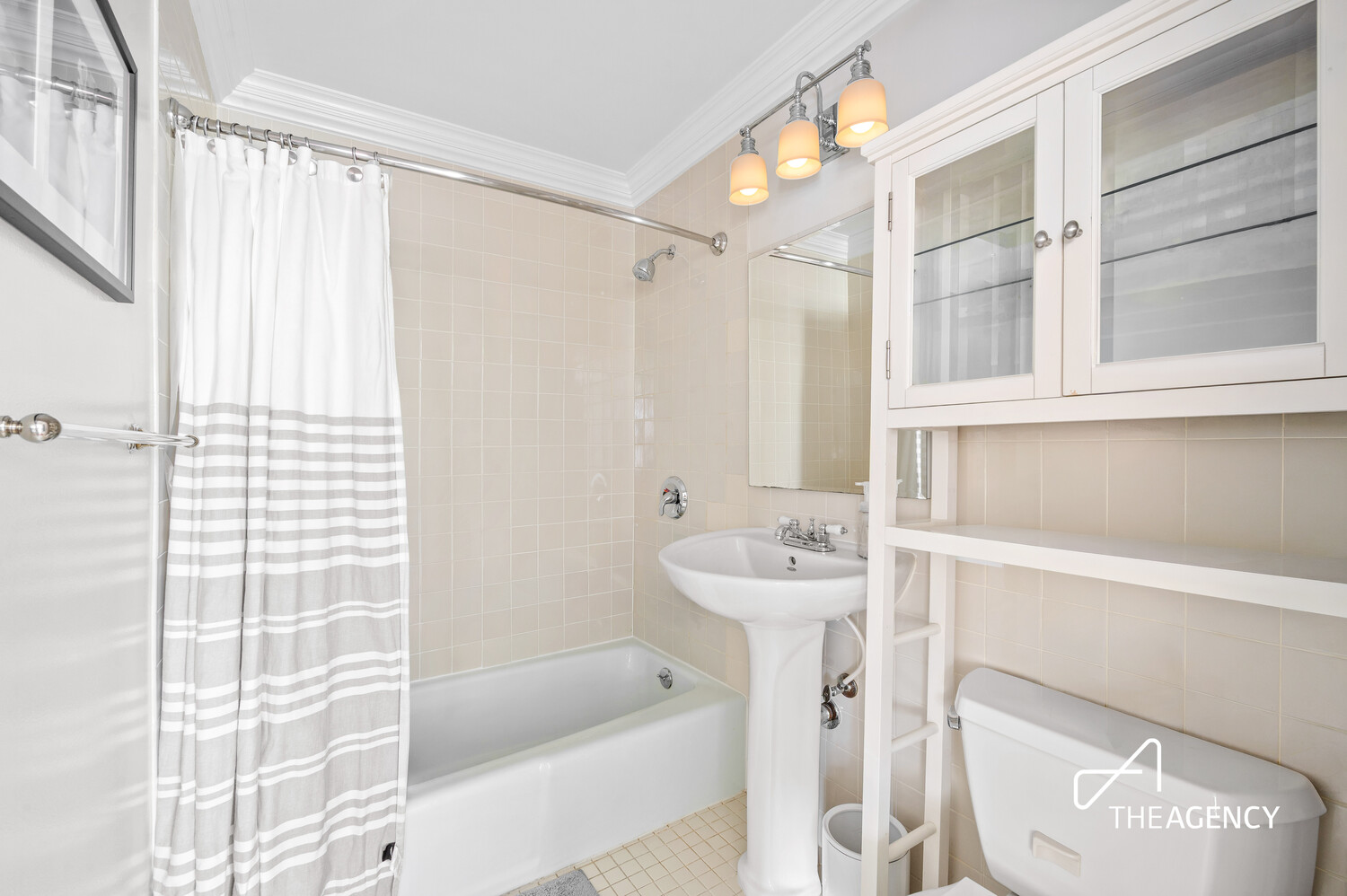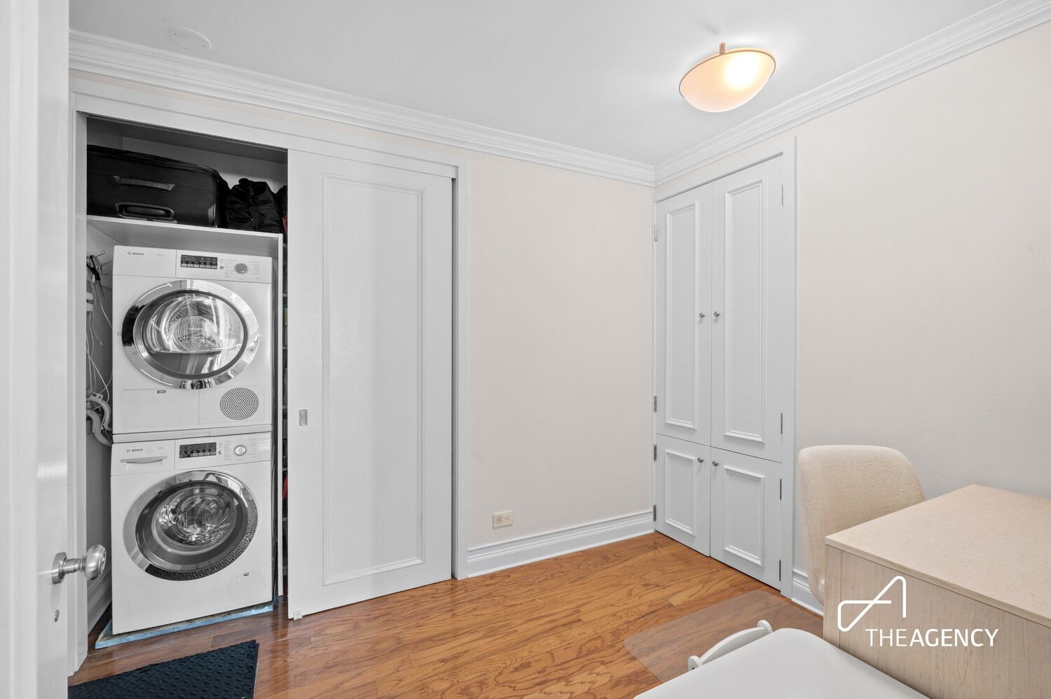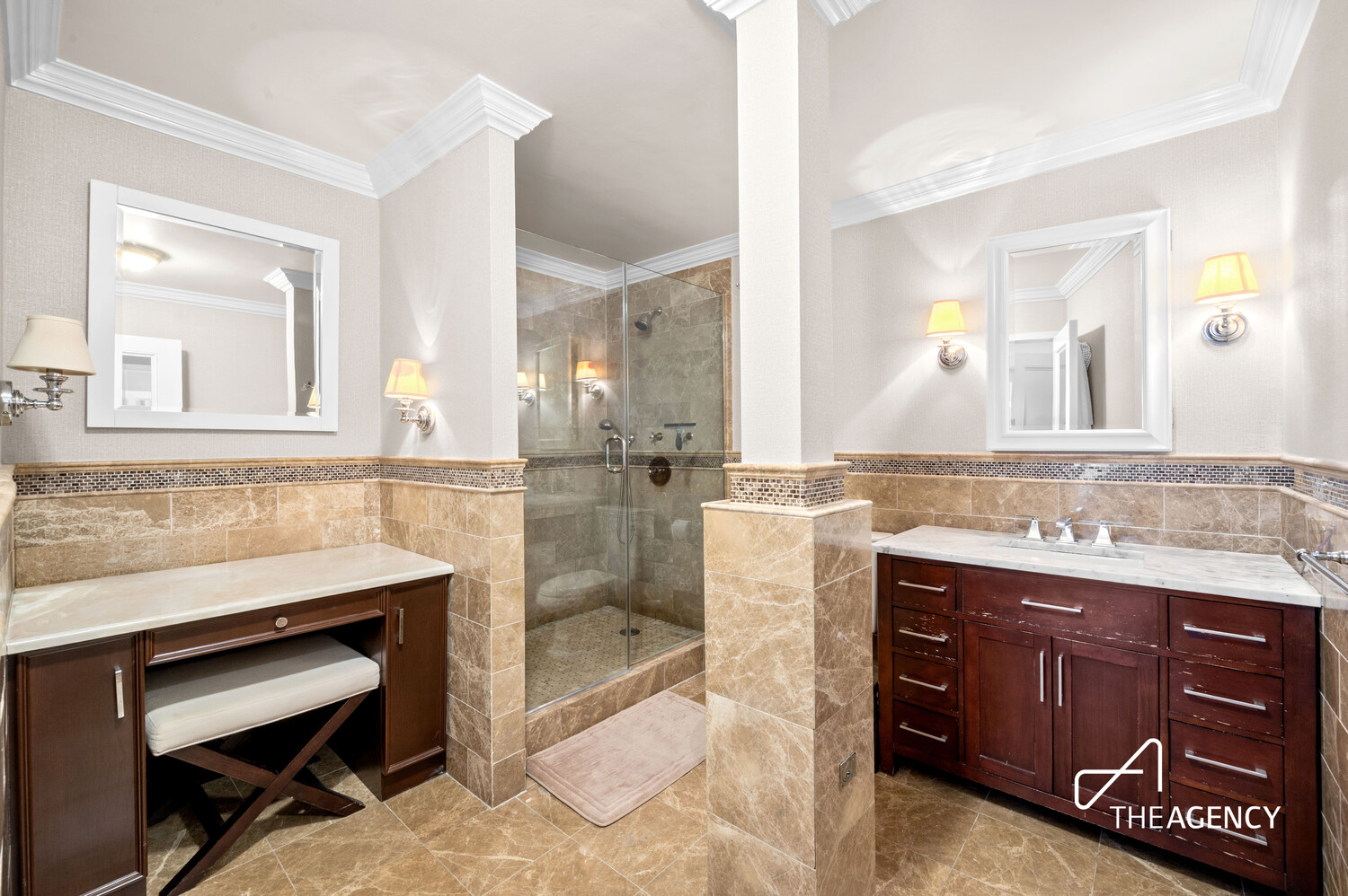 The spa-like primary bath features beautiful Emperador Light stone and Turkish mosaic tile, a separate makeup vanity, and an oversized walk-in shower with a waterfall showerhead. Additional highlights include an in-unit Bosch washer/dryer, Bosch dishwasher and thoughtfully designed closets with automatic lighting.
