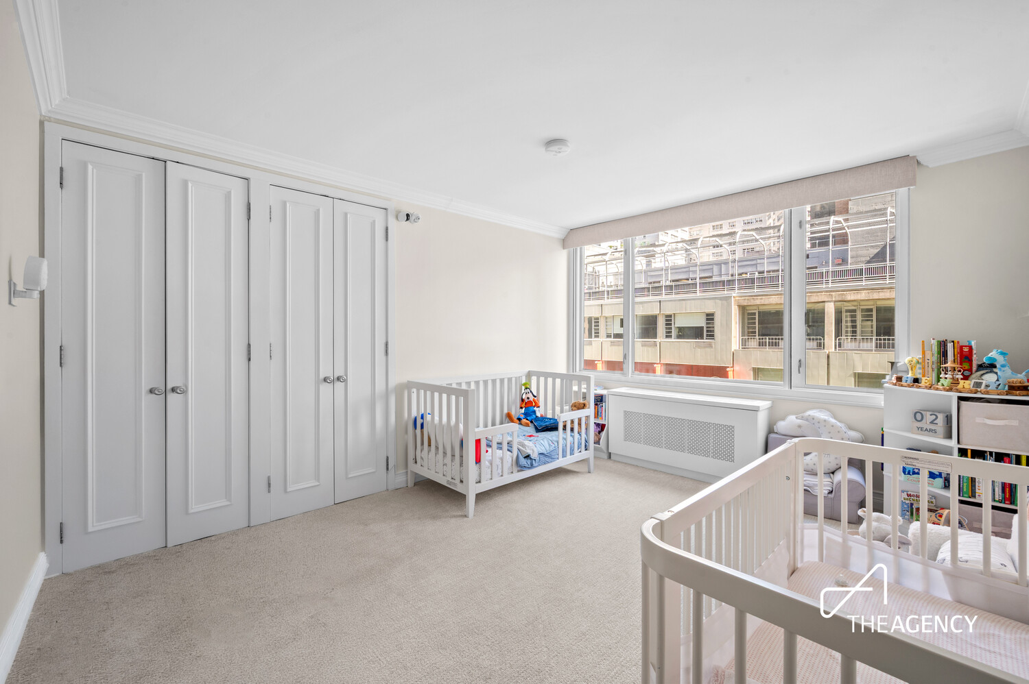 Northern facing, the expansive living and dining area welcomes abundant natural light to dance throughout the space all day. Both bedrooms offer generous custom built-in storage, while the king-size primary bedroom also houses a media closet with high-end equipment servicing the fully-wired apartment. In addition to the bedrooms, there is a flexible third room suitable for a home office, guest room or bonus space that suits your needs.