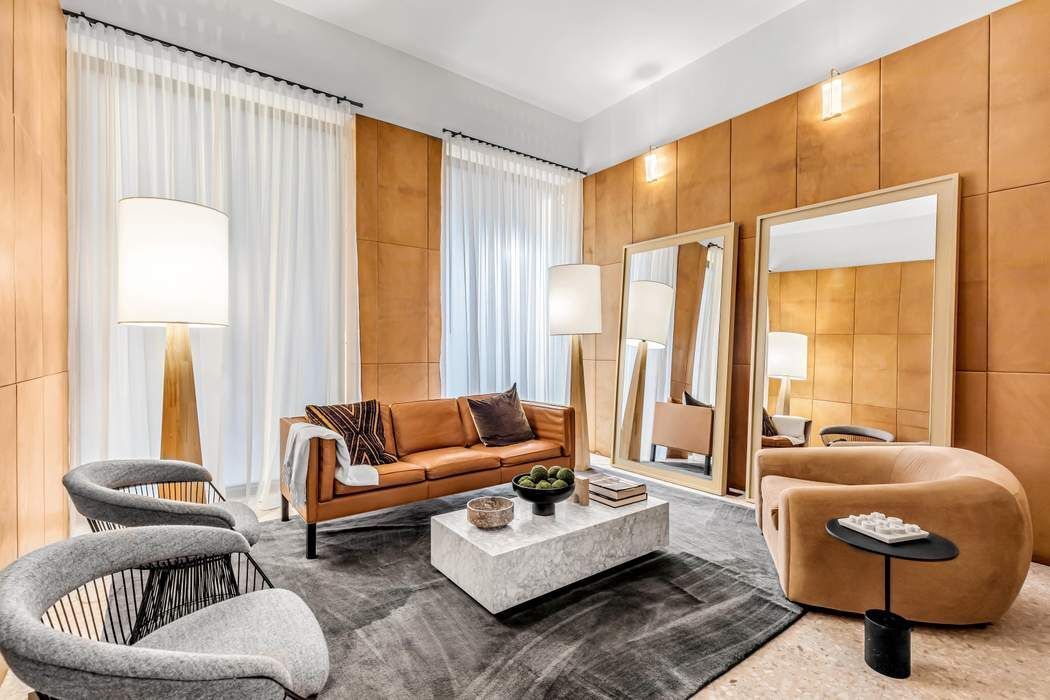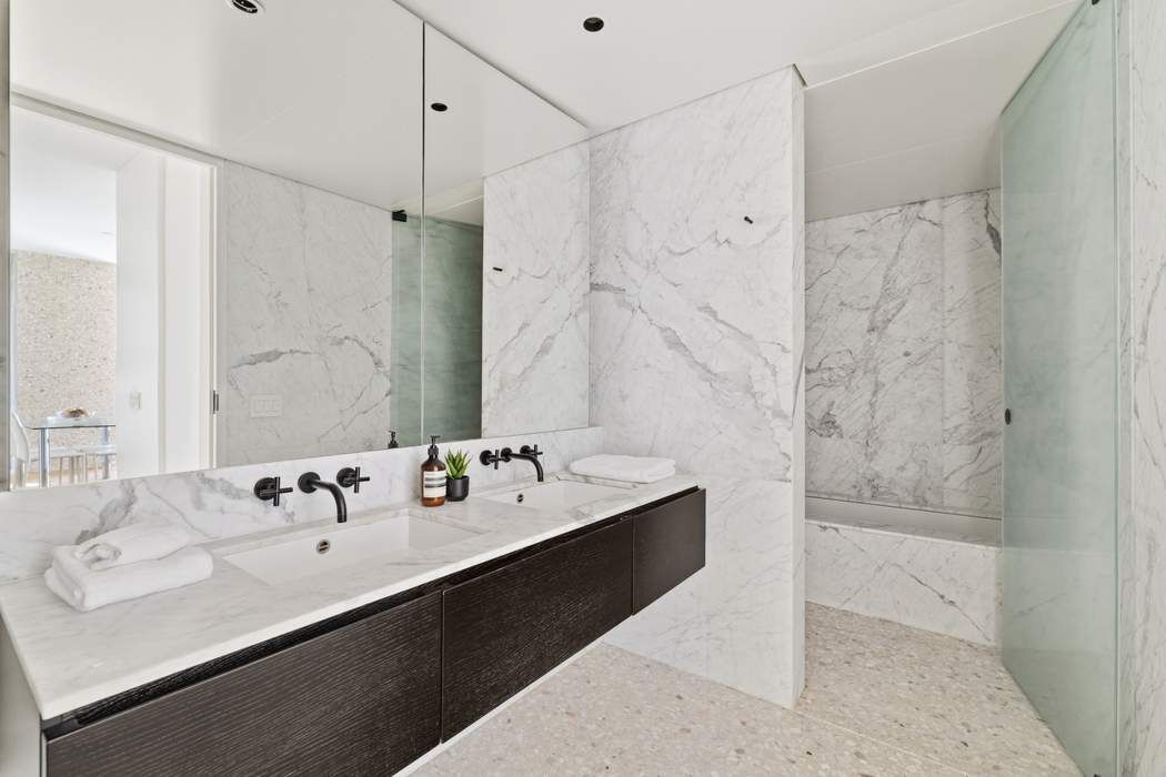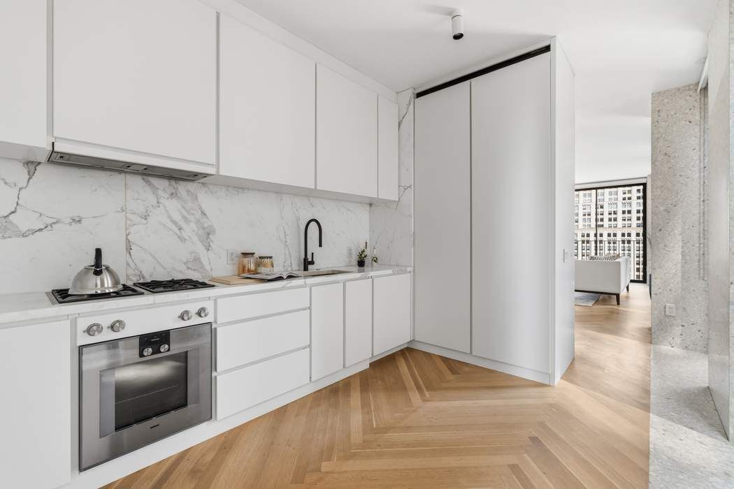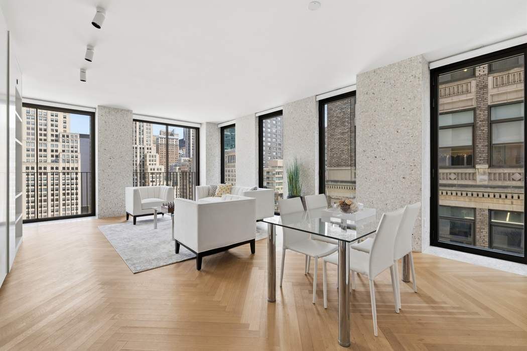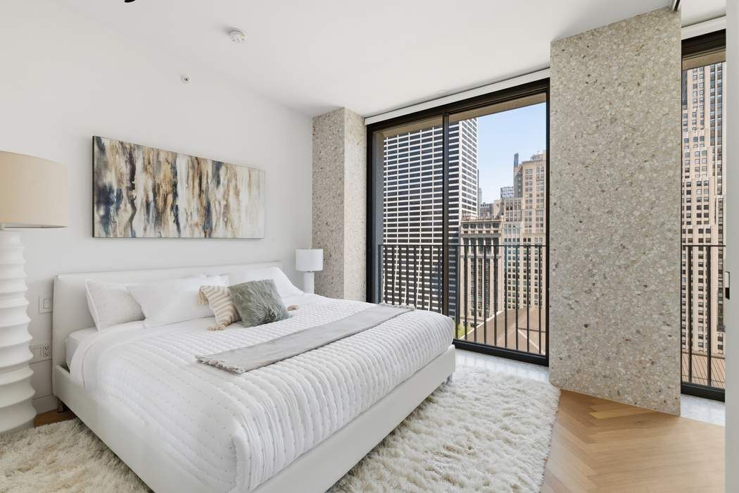 Designed by Pritzker Prize–winning architect David Chipperfield, residence 20B at The Bryant is a corner one-bedroom home defined by exceptional light, views, and refined design. Nine floor-to-ceiling Vitrocsa windows flood the space with natural light from eastern and northern exposures, offering sweeping views over Bryant Park and Fifth Avenue. The custom marble terrazzo facade transitions seamlessly to the interiors, creating crisp architectural frames to the windows and a border for the heated oak herringbone floors. The windowed custom kitchen features sleek white lacquer millwork, Calacatta Gold marble countertops, backsplash, and side panels, along with a full suite of Gaggenau appliances and a fully vented range hood. The well-proportioned bedroom sits just off the living area and offers convenient access to a luxurious bathroom features Statuarietto marble walls, complete with a double vanity and a rain shower within an enclosed wet room. Additional highlights include 9’4” ceilings and an in-unit Bosch washer and dryer. The Bryant, residents have access to a full range of building amenities including: - Full-service condominium with 24-hour attended lobby. - Lobby lounge with terrazzo floors and leather paneled walls. - State-of-the-art fitness center with sauna. - The Terrazzo lounge on the 6th floor featuring a full bar, stunning double height ceilings, a fireplace and a heated terrace overlooking Bryant Park