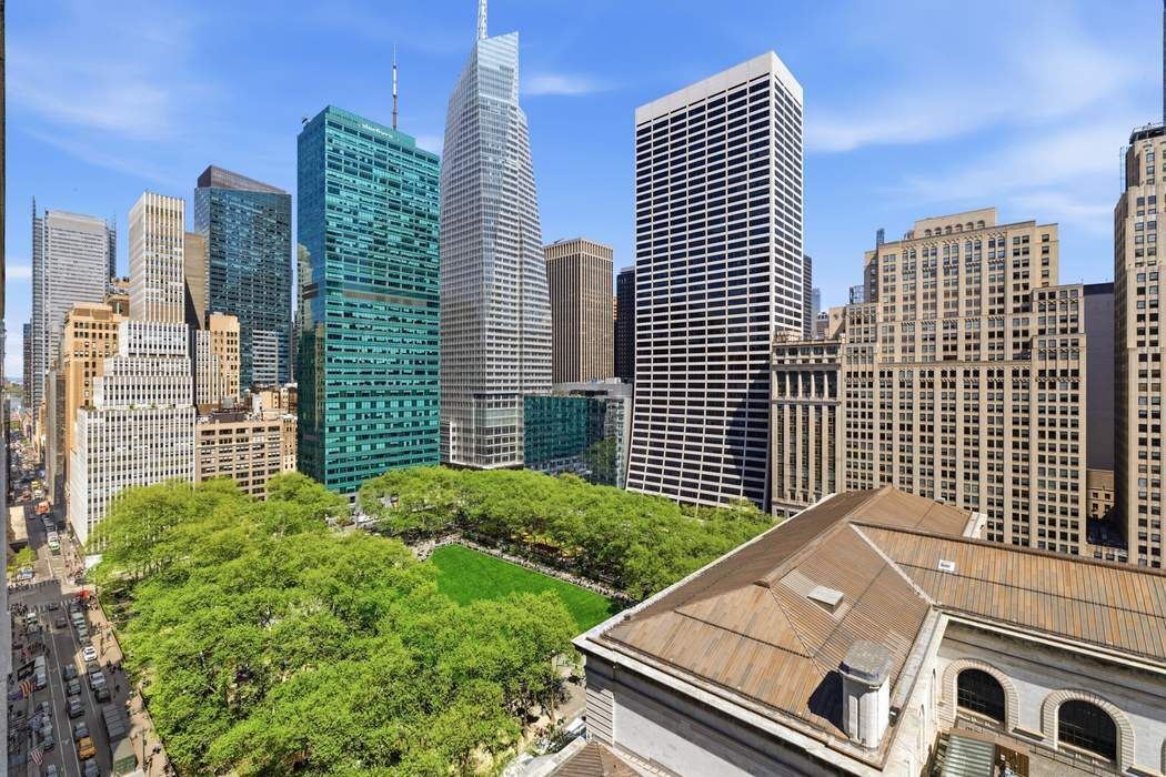 • Designed by Pritzker Prize–winning architect David Chipperfield, residence 20B at The Bryant is a corner one-bedroom home defined by exceptional light, views, and refined design. Nine floor-to-ceiling Vitrocsa windows flood the space with natural light from eastern and northern exposures, offering sweeping views over Bryant Park and Fifth Avenue. The custom marble terrazzo facade transitions seamlessly to the interiors, creating crisp architectural frames to the windows and a border for the heated oak herringbone floors. The windowed custom kitchen features sleek white lacquer millwork, Calacatta Gold marble countertops, backsplash, and side panels, along with a full suite of Gaggenau appliances and a fully vented range hood. The well-proportioned bedroom sits just off the living area and offers convenient access to a luxurious bathroom features Statuarietto marble walls, complete with a double vanity and a rain shower within an enclosed wet room. Additional highlights include 9’4” ceilings and an in-unit Bosch washer and dryer. The Bryant, residents have access to a full range of building amenities including: - Full-service condominium with 24-hour attended lobby. - Lobby lounge with terrazzo floors and leather paneled walls. - State-of-the-art fitness center with sauna. - The Terrazzo lounge on the 6th floor featuring a full bar, stunning double height ceilings, a fireplace and a heated terrace overlooking Bryant Park