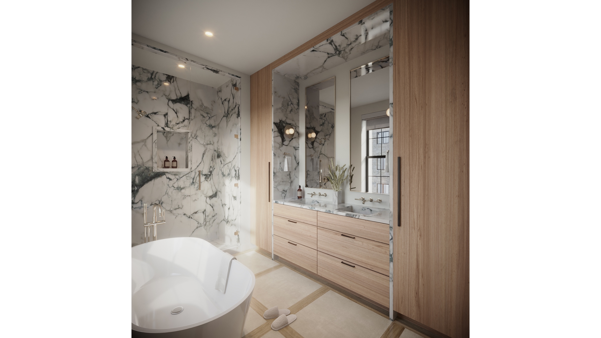 Primary suites are tranquil sanctuaries flooded with natural light, anchored by beautifully detailed millwork. Bathrooms are true spa retreats featuring Calacatta Paonazzo and Calacatta Turquoise marble, lime washed walls, custom vanities, and a curated selection of burnished brass Kohler Purist fixtures. Freestanding soaking tubs and oversized stone-framed showers create an atmosphere of calm and indulgence that rivals world class hotels.
