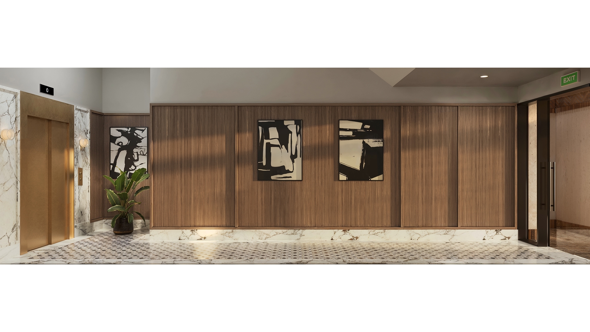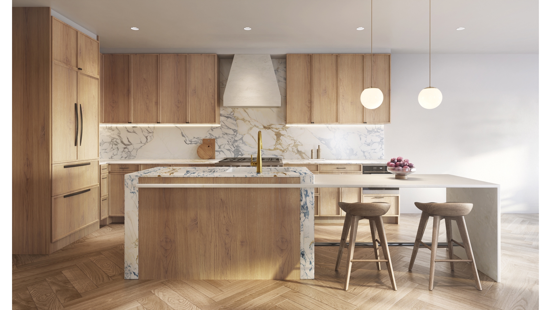 The kitchens are sculptural showpieces. Custom millwork frames striking slabs of Arabescato Antico marble across the countertops and full-height backsplash, while a dramatic waterfall island becomes the natural centerpiece of the home. Integrated brass accents and artisan pendants add depth and warmth. Every residence is equipped with ultra luxury appliances including a Miele refrigerator and freezer, Wolf gas range, built-in microwave, Bosch dishwasher, and wine fridge. Many units also feature a beautifully appointed butler's pantry and wet bar with additional storage, reeded glass detailing, and bar sink functionality that further elevates the home's entertaining capabilities.