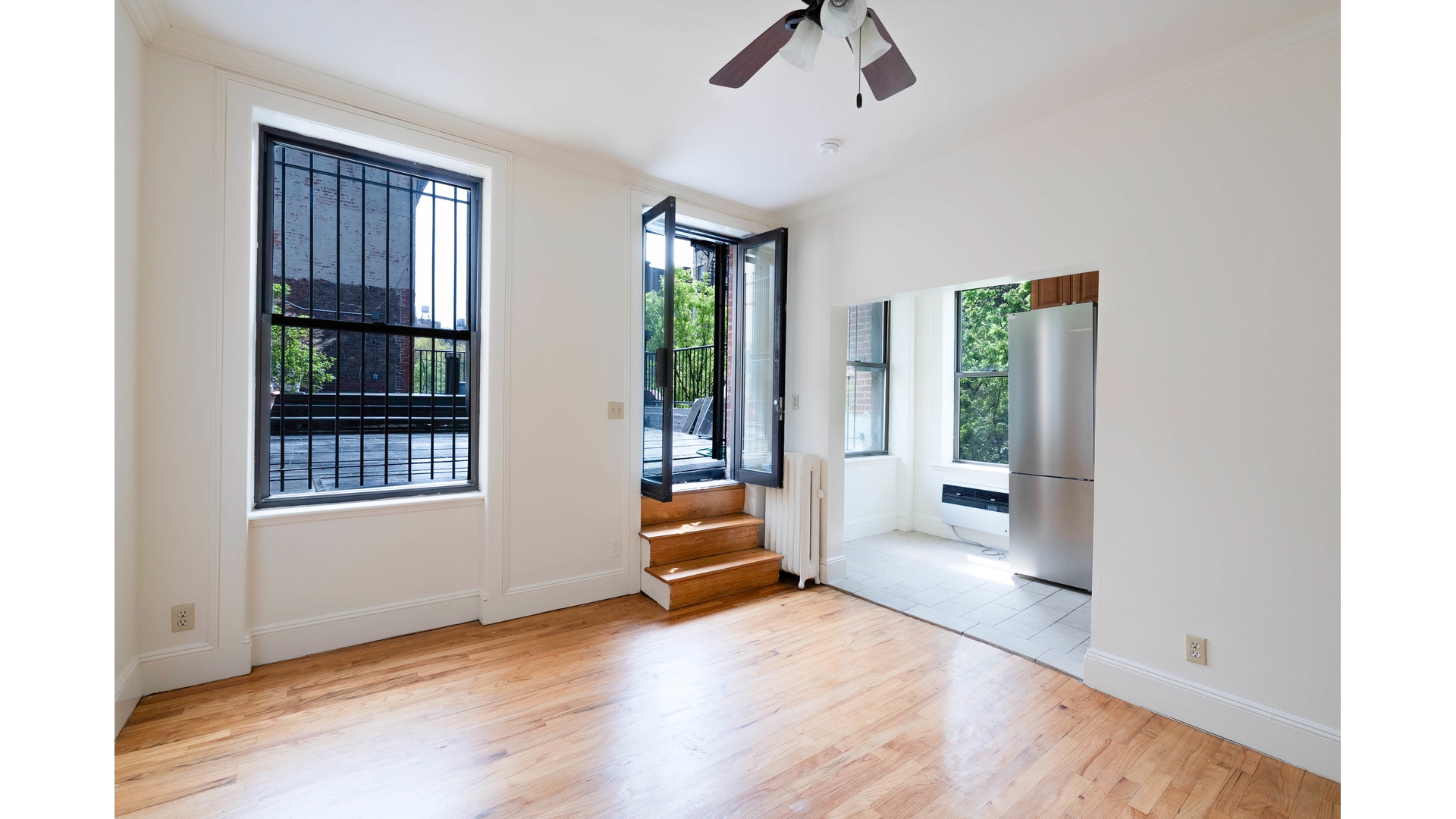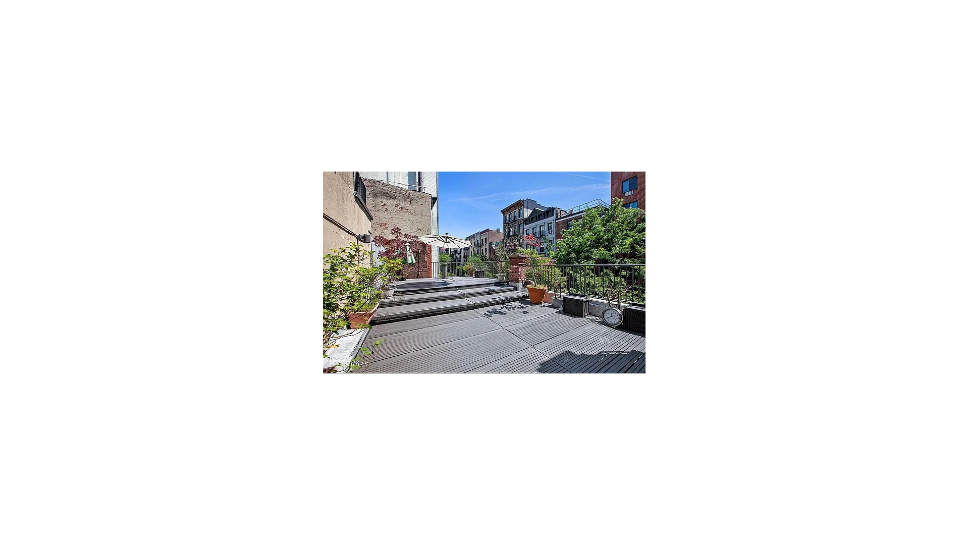 This private patio is elevated and not on the ground floor, positioned three stories above street level, two flights up, to offer enhanced privacy and open views.