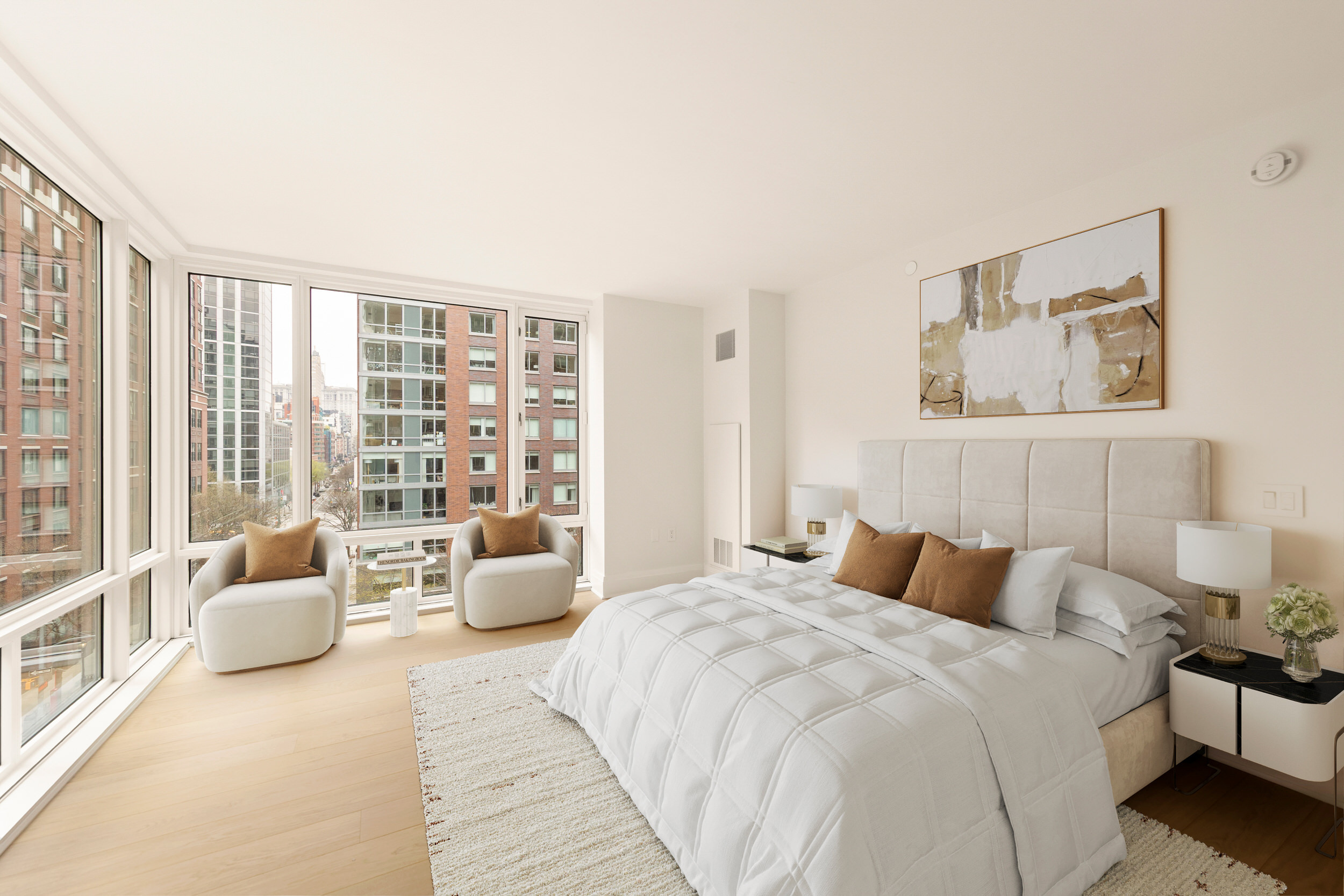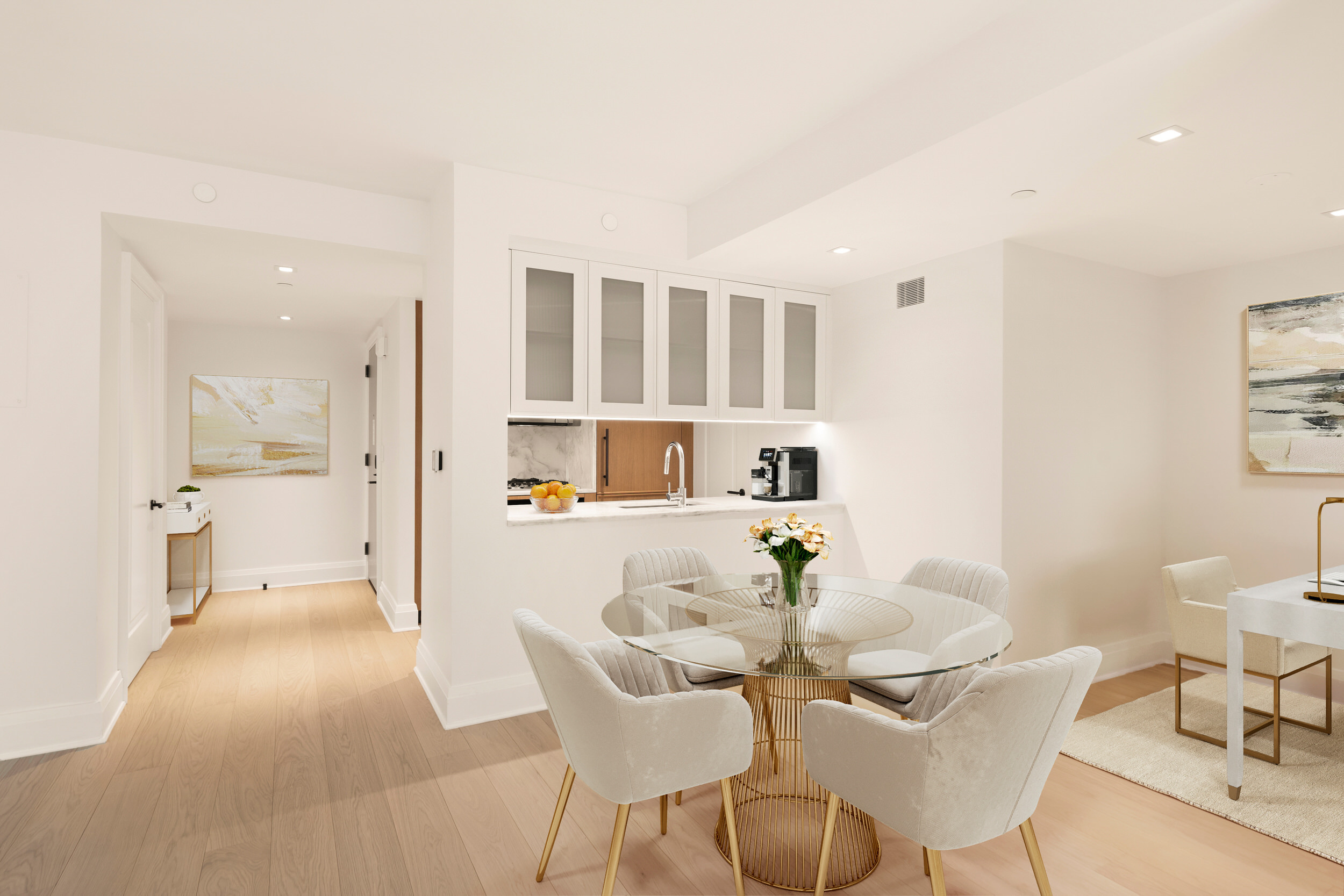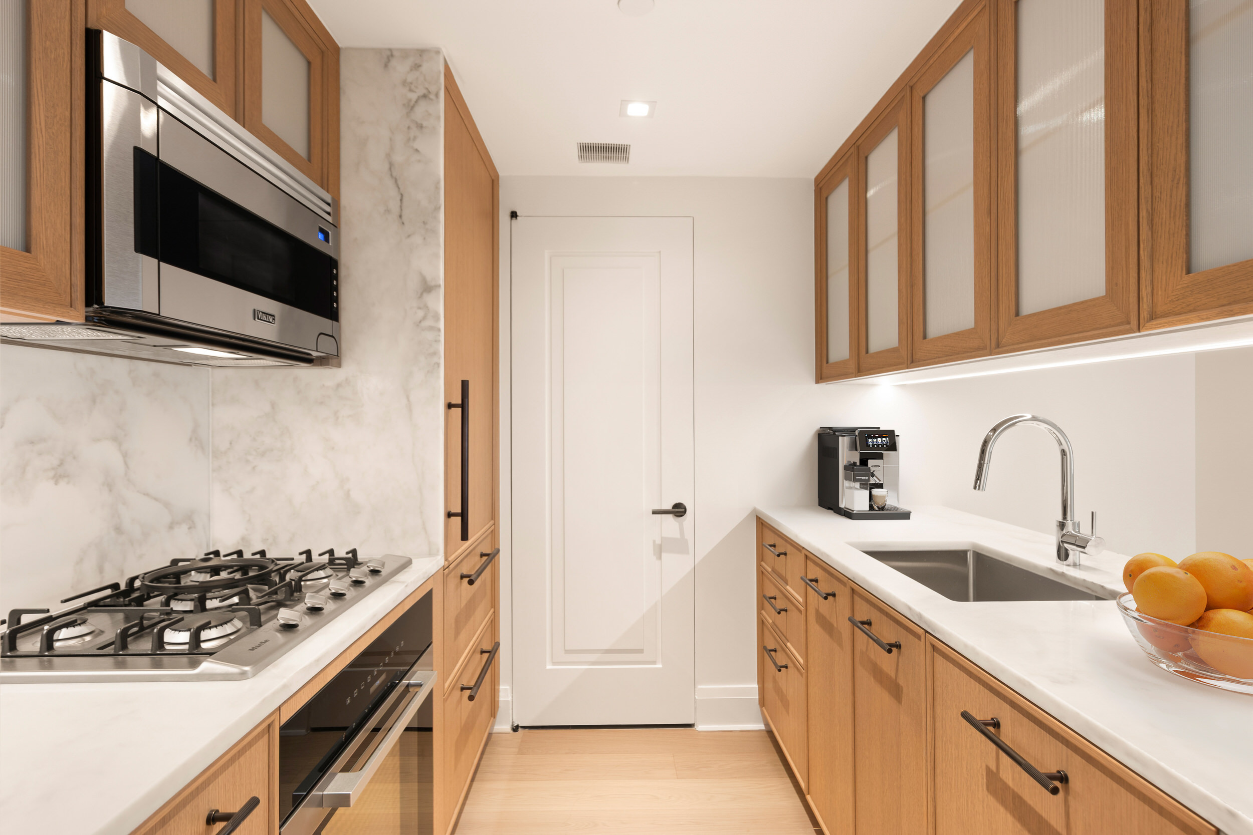 Unit 7A has a one-of-a-kind corner layout that features a home office, 2 split bedrooms and full baths. This residence features 7-inch wide-plank oak flooring throughout; the semi-open kitchen employs Miele appliances and oak cabinetry; the spa bathrooms feature custom vanity. This home comes complete with a Miele washer and dryer, and ample closets with select California Closets outfitting.
