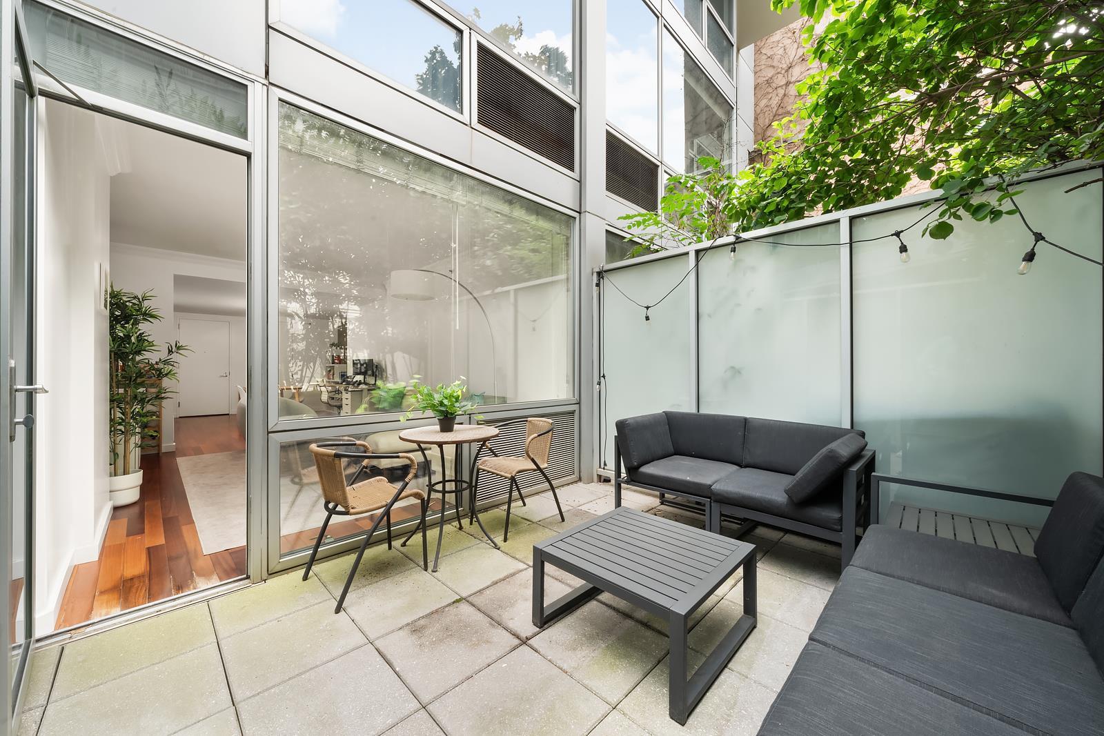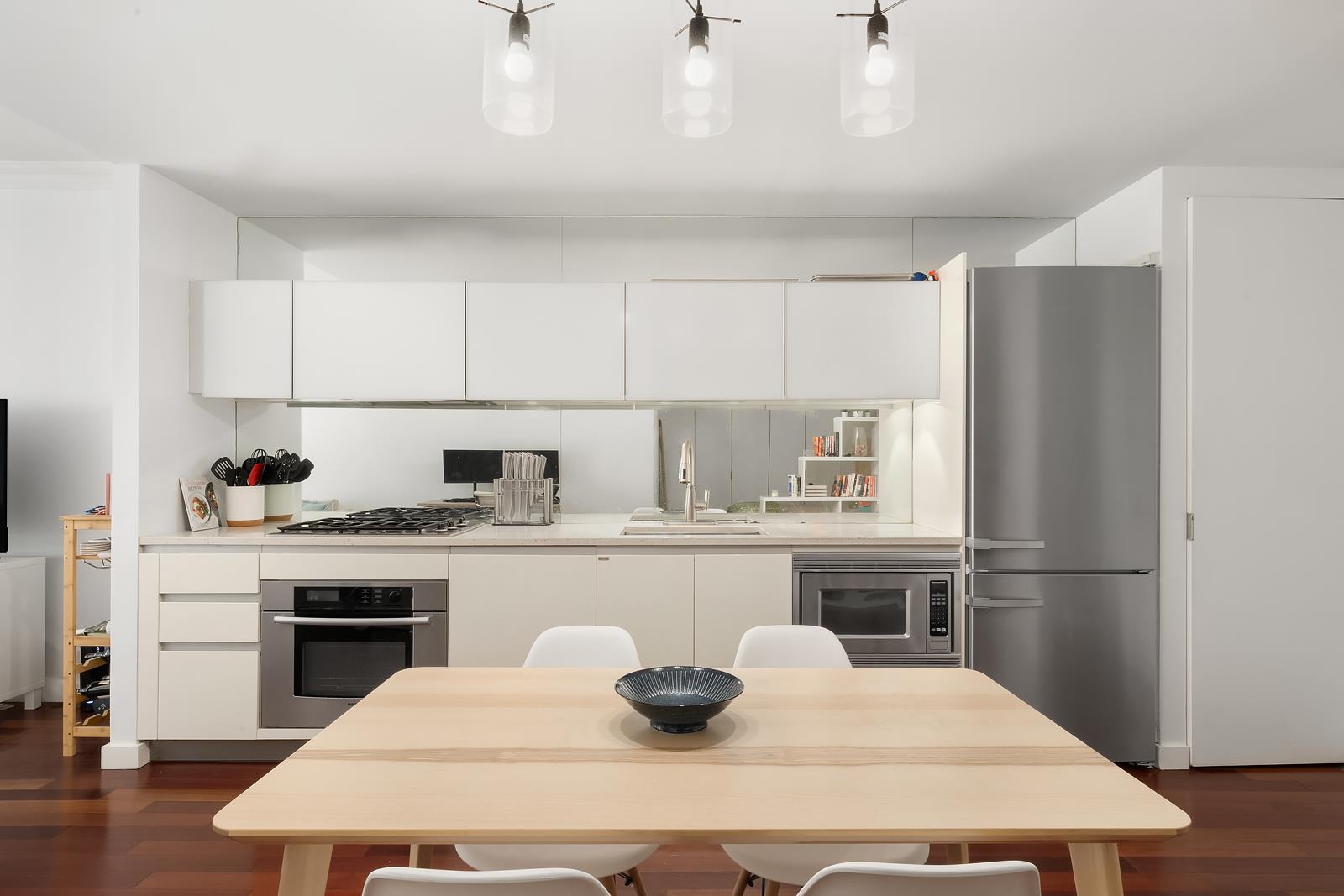 This stunning loft-style apartment showcases intelligent design, maximizing space and light with a 32-foot living/dining area, serene northern views through oversized windows, and a private patio. The open-concept kitchen features sleek white lacquer cabinetry, a glass backsplash, stone countertops, and a premium appliance suite by Bosch and Liebherr. The seamless flow into the living space creates an ideal setting for entertaining. The generous sleeping alcove includes a wall of ample closets and is elegantly separated from the bathroom by a frosted glass sliding door. The spa-like, renovated bathroom is adorned with floor-to-ceiling white subway tiles, a large step-in glass shower, mirrored medicine cabinet, wood vanity with a circular sink, and penny round tile flooring. High ceilings and rich cherry hardwood floors enhance the welcoming atmosphere throughout.