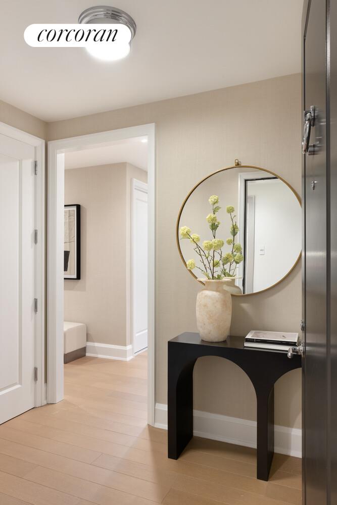 Displaying a refined finish palette hand-selected by Robert A.M. Stern Architects, all residences at Claremont Hall include a custom-designed solid wood entrance door with polished chrome hardware, wide plank European white oak flooring, expansive, high-performance windows, and up to 10" ceilings. Select residences feature generous bay picture windows and Gothic-inspired arched windows. Kitchens at Claremont Hall feature custom Italian cabinetry in soothing Classic Bianco or Modern Grigio lacquer, topped by Calacatta Laza quartz countertops and backed by a ceramic tile backsplash and a paneled appliance package from Bosch, with a custom range hood with integrated spice shelf. Paneled wine refrigerators are included in select residences.