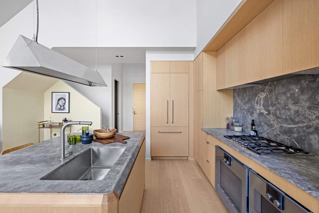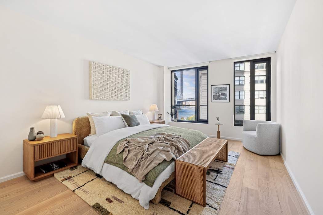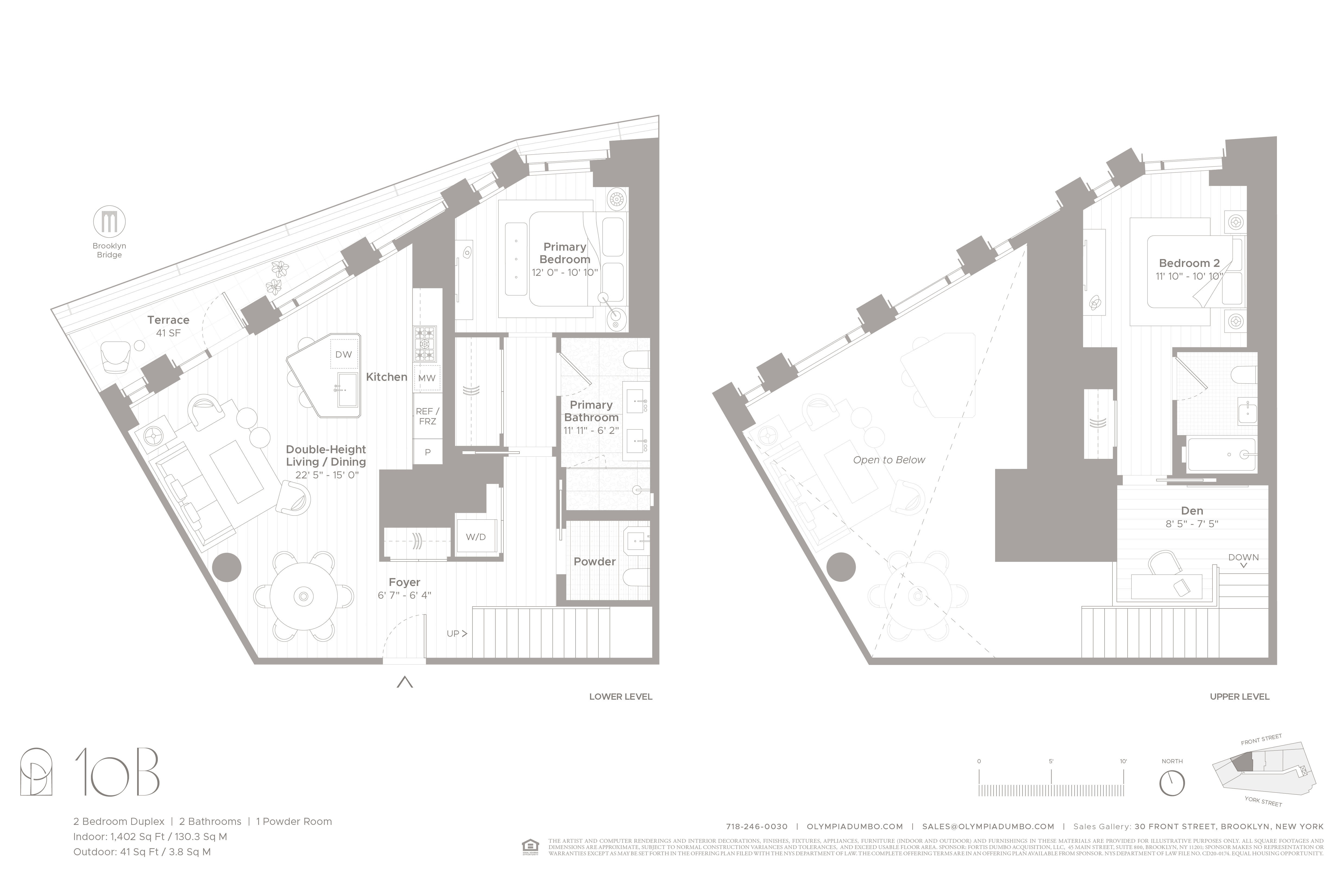 • Immediate Occupancy. On-site model residences now available to tour by appointment. Introducing Duplex Residence 10B, featuring ceilings soaring up to 18', two bedrooms, and two-and-a-half bathrooms. Upon entry, the double-height foyer introduces the grand light-filled living space. The impeccably tailored Workstead-designed kitchen merges exquisite detail with rich materials. Featuring a statement kitchen island with inlaid Fior di Bosco stone slab and chamfered edges, raked maple cabinetry and millwork paired with satin nickel hardware and top-of-the-line Gaggenau appliances, the kitchen proves an integral part of the generous open living and dining area with oversized windows that look on to the private terrace. Discretely located off the foyer, the primary bedroom is complemented by an en-suite bathroom with Agglo Ceppo honed stone walls, flooring and countertops, and a custom-slatted white maple double vanity with satin nickel cabinetry pulls, deck-mounted faucet and oak controls. The lower level is concluded with a powder room featuring a refined pedestal vanity in African St. Laurent stone with a honed finish and chamfered edges, a hidden mirror behind wood shutters, and white maple-clad walls. On the upper level, meeting the soaring ceilings of the living space below, a private den and spacious secondary bedroom await. The en-suite secondary bathroom incorporates mosaic tile flooring, undermount tub with brushed nickel fixtures, custom vanity in maple with edge detail and a round mirrored medicine cabinet. A concealed laundry closet with LG washer & dryer completes the offering. Olympia is a modern interpretation of its surroundings. Rising tall from the heart of historic Dumbo, Olympia offers expansive views of the sun-drenched harbor and Lower Manhattan skyline from the highest crest in the neighborhood. Exteriors by Hill West Architects and interiors by Workstead, the 76 homes reflect a sense of scale and rhythm, and a palette of colors and materials that is grounded in the maritime and industrial heritage of Dumbo’s waterfront. Olympia is designed to maximize comfort and convenience, boasting over 38,000 SF of indoor and outdoor services and amenities spread over 3 levels. The Garden level features our ground floor amenities. Through a private entry court, a contemporary porte cochère welcomes you to a sheltered vestibule, and to the building’s triple-height lobby. The fully serviced lobby features a sculpture by Jacob Hashimoto and floor-to-ceiling window walls. Adjoining the lobby is the private garden lounge overlooking the MPFP-landscaped Gair Gardens. Located in the building’s lower level, The Club is all about fun and fitness, complete with a game lounge, bar, two-lane bowling alley, state-of-the-art fitness center, spin studio, boxing gym, private locker rooms and maritime-themed kid’s playroom. The Bridge level of Olympia, on the 10th floor, offers a variety of indoor & outdoor amenities dedicated to recreation and relaxation. Features include a 60’ indoor lap pool, wellness amenities, juice bar, a 58’ outdoor pool and hot tub, cabanas, barbecue areas, children’s ship-inspired playground & waterpark, and a full-size tennis court overlooking the Brooklyn Bridge, lower Manhattan and beyond. Additional services include private on-site parking available for rent or purchase, 24-hour doorman and concierge, package room with refrigerated storage, bicycle storage and private residential storage available for purchase. Sponsor: Fortis Dumbo Acquisition, LLC, 45 Main Street, Suite 800, Brooklyn, NY 11201; Sponsor makes no representation or warranties except as may be set forth in the offering plan filed with the NYS Department of Law. The complete offering terms are in an offering plan available from sponsor. NYS Department of Law File No. CD20-0174. Equal Housing Opportunity. Co-exclusive.