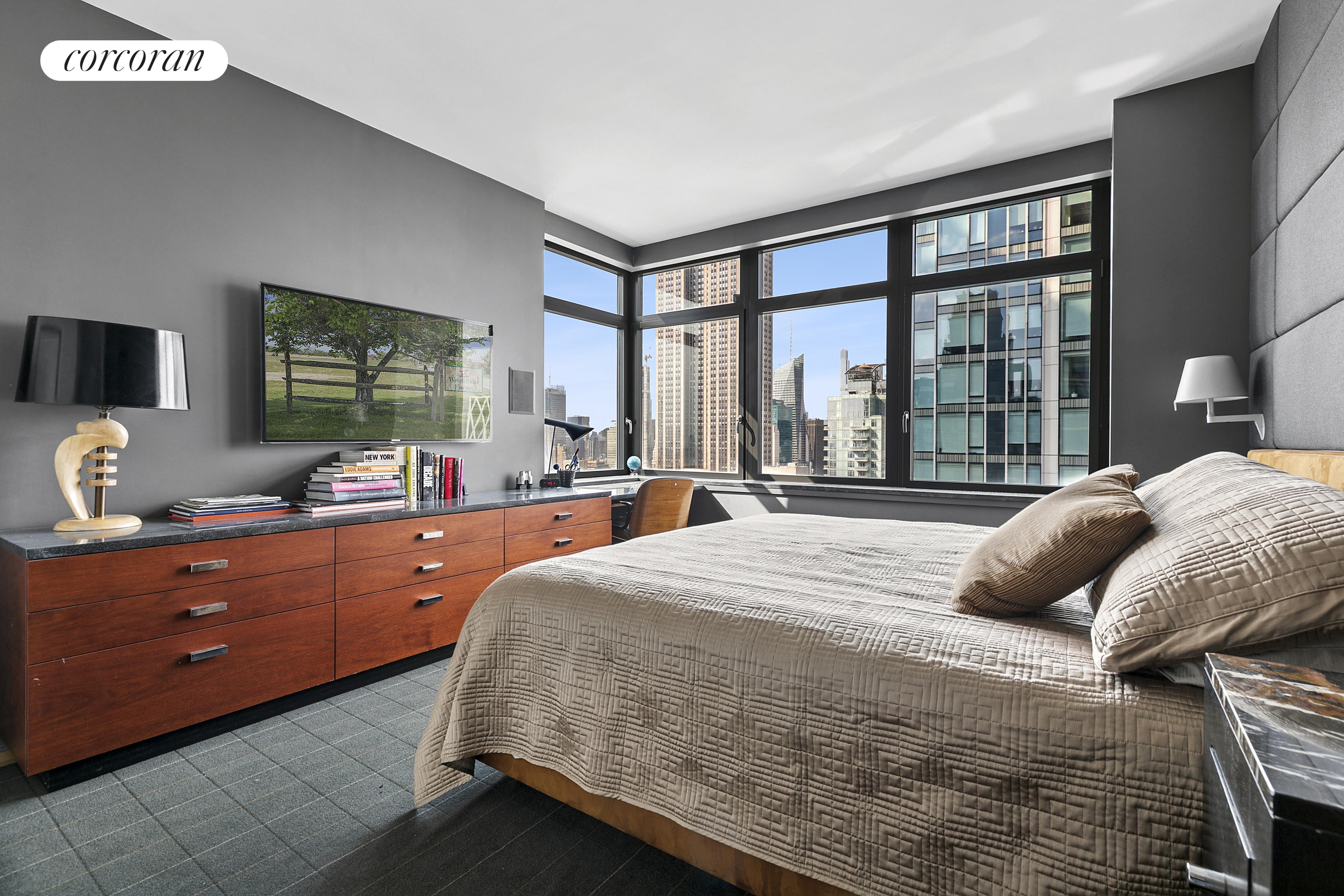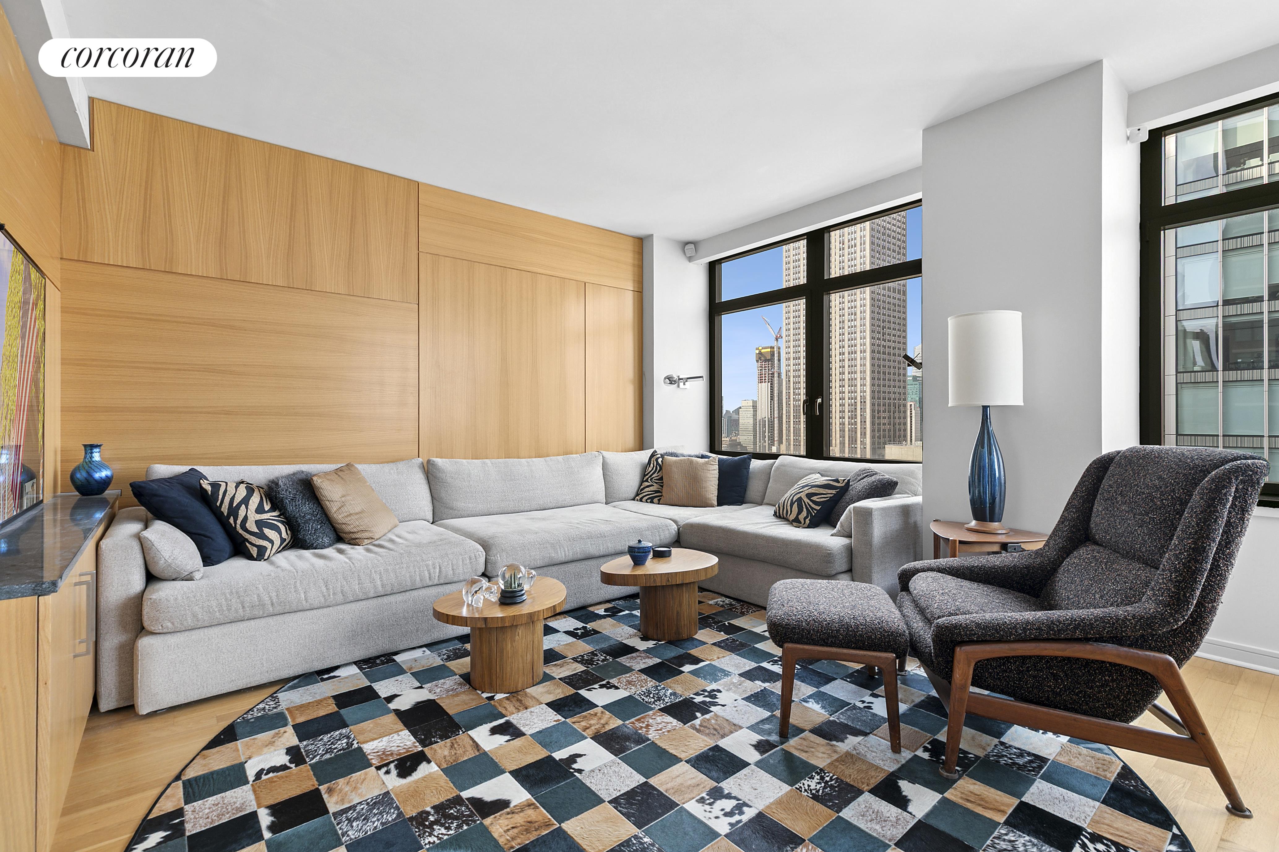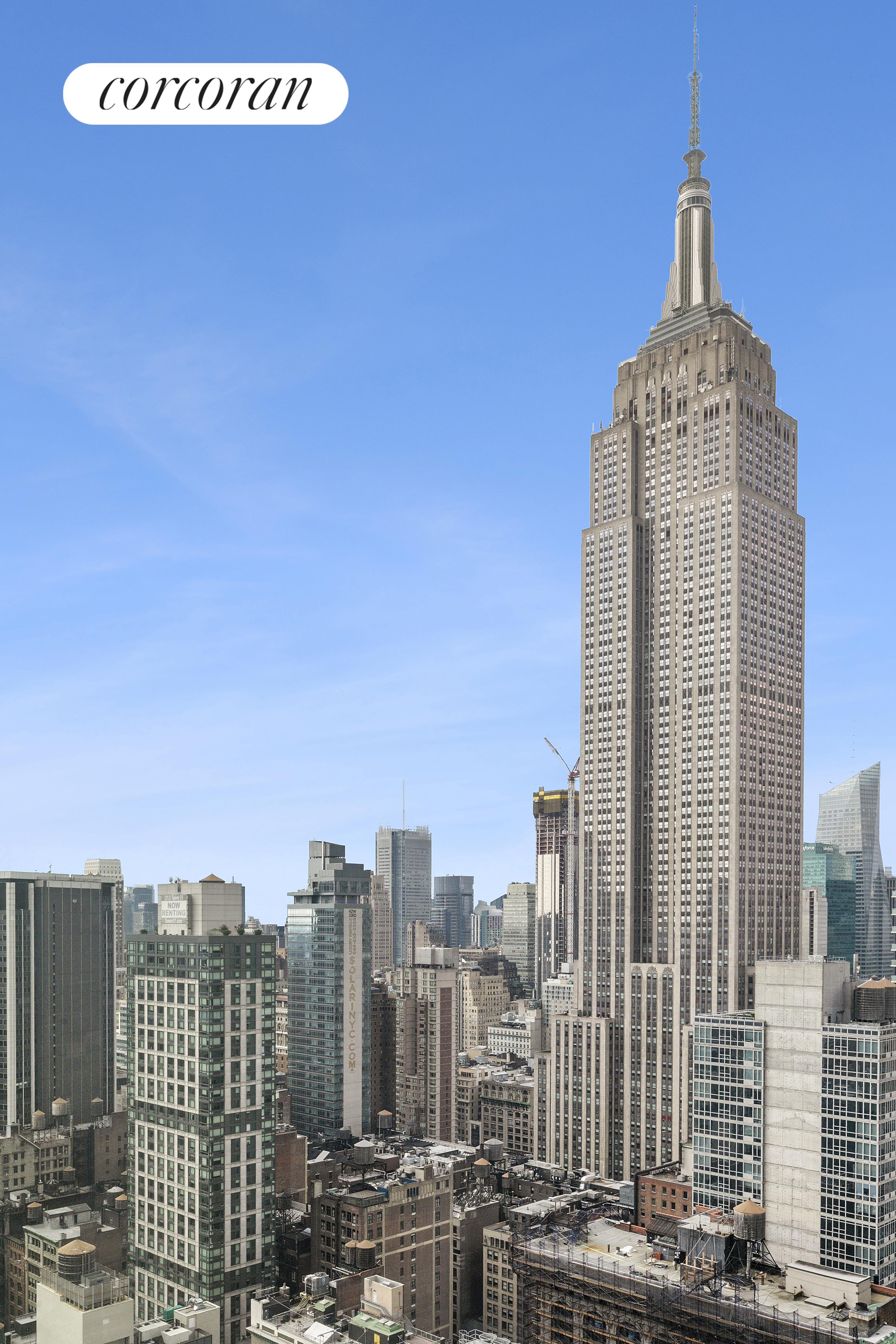 Thoughtfully customized this tasteful, sun-lit apartment features dramatic Northern, Eastern, and Western exposures through oversized windows; showcasing an iconic New York City skyline, with landmarks such as the Empire State Building, Chrysler Building, and glimpses of both the Hudson and East Rivers.