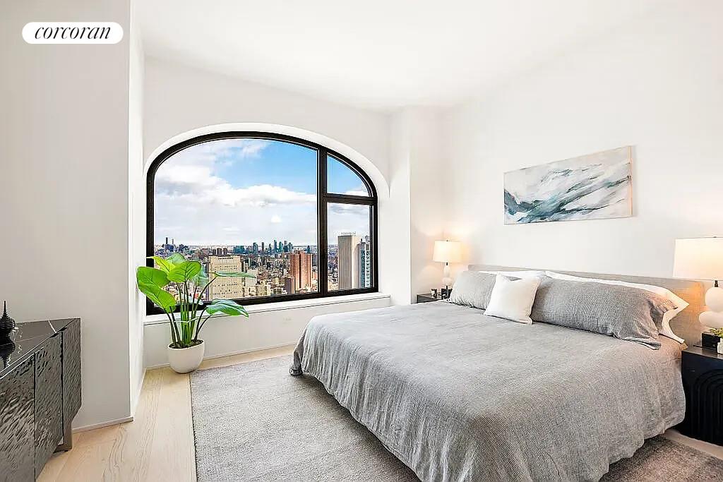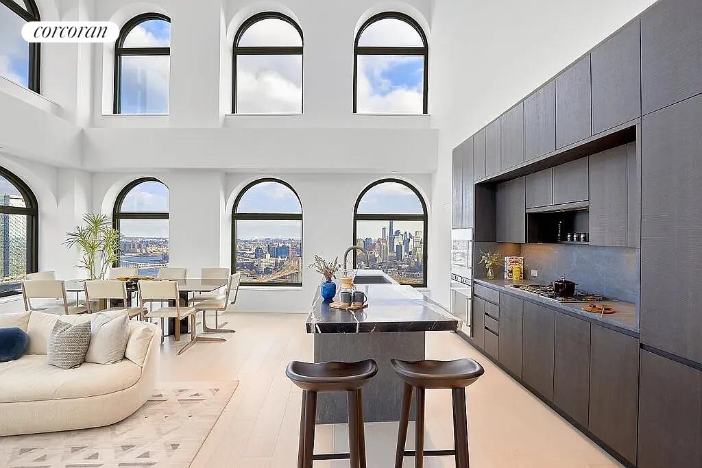 Residence 50A is a four bedroom, four and a half bathroom home featuring a dramatic double-height living and dining area with soaring ceilings approaching 19 feet. Oversized arched windows with elegant bronze detailing frame panoramic river and New York City skyline views. Interior finishes include wide-plank white oak flooring and oil rubbed bronze fixtures custom designed by Sir David Adjaye. The residence boasts an open kitchen with custom Pedini Italian textured blackened oak cabinetry, Salvatori Pietra Cardosa marble countertops and backsplash hand-selected from the Apuan Alps in Tuscany with a Salvatori Nero Marquina cantilever providing additional seating, and state-of-the-art appliances by Gaggenau and Thermador, including a double oven and wine storage. The corner primary bedroom suite has a generous walk-in closet and a luxuriously appointed bathroom with textured Italian Bianco Carrara marble, a custom Pedini Italian millwork double vanity, an expansive shower and 6-foot soaking tub, and radiant heated floors. There are three generous secondary bathrooms in the residence with custom Pedini Italian millwork vanities and either a soaking tub or expansive shower, two complete with Salvatori Grigio Versilia marble throughout and the other with Salvatori Bianco Carrara marble throughout. The third bedroom is easily convertible into a library or home office. The residence opens upon a generous formal gallery with a powder room featuring floor-to-ceiling Salvatori Italian Grigio Versilia marble with a textured bamboo finish and a Salvatori Italian walnut sink with a Grigio Versilia stone basin. A separate utility room offers a washer, dryer, and sink.