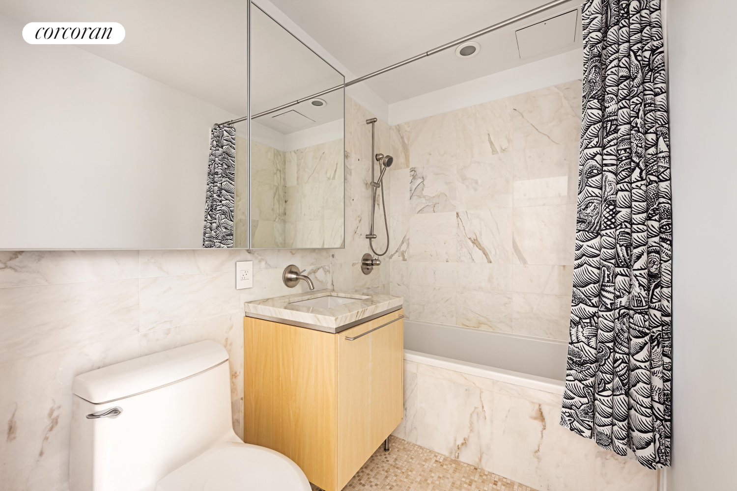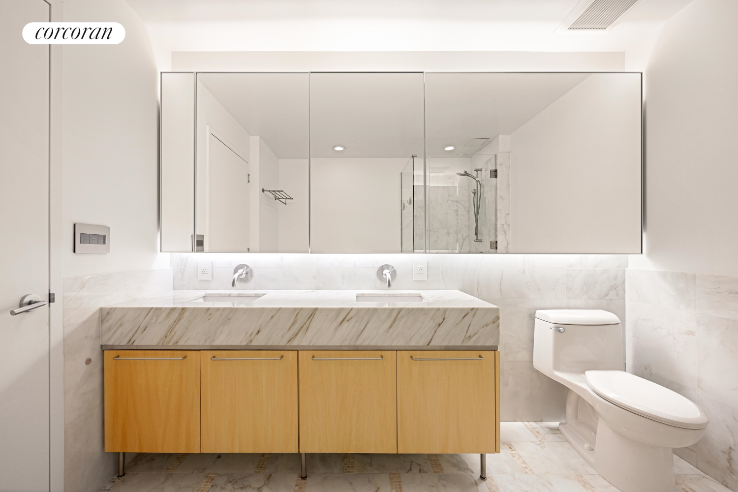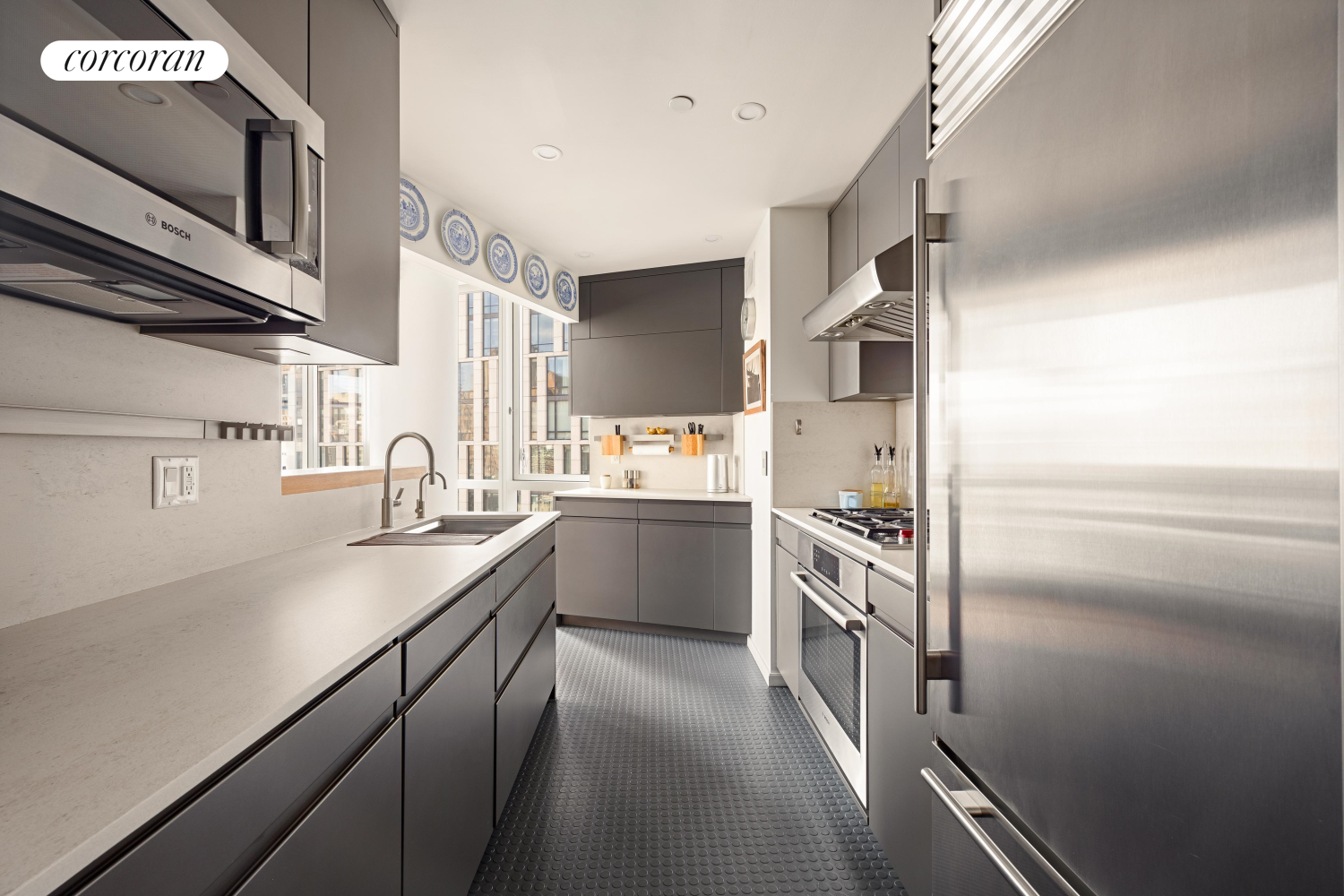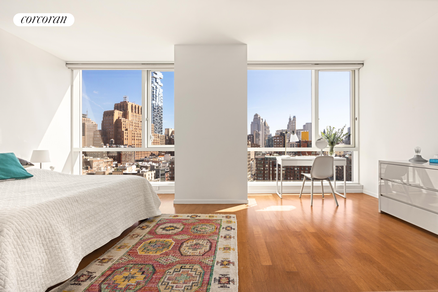 Spectacular open views from every room with this 2-bedroom, 2.5-bath corner unit at Tribeca's premier luxury full-service condominium, 200 Chambers Street. With 1345 sq ft and high ceilings, the sun rises each morning to reveal expansive city skyline views of the historic Tribeca architecture from every room through oversized floor-to-ceiling windows. The spacious living area enjoys two exposures, East and South (even Western sunset light streams in in the afternoon because of the way the building is angled), combining living and entertaining in an open, expansive setting. The open kitchen was thoughtfully re-designed and expanded using custom Leicht cabinetry, Kohler sink, Franke faucets (with water filtration system), Sub Zero, Wolf, Miele, and Bosch appliances, and a butcher's block island. Both bedrooms showcase the same breathtaking views over Washington Market Park and Tribeca looking East. The king-sized primary suite is a pin-drop quiet, light-filled oasis high above the city with plenty of room for a separate sitting area or home office space. It is complemented with a walk-in closet and large en suite bathroom with dual vanities, a deep soaking tub and separate shower. The large second bedroom also has a generous closet, fantastic light, and a full en suite bathroom. An additional, spacious powder room is available for guests and conveniently includes a new in-unit Electrolux washer/dryer. Other smart upgrades worth noting: Upgraded HVAC units and bathroom fans for quieter operation, Nest thermostats to allow for remote operation of HVAC units, Gardall fire safe installed, Legrand outlets & switches with dimmers and timers, custom shades throughout.