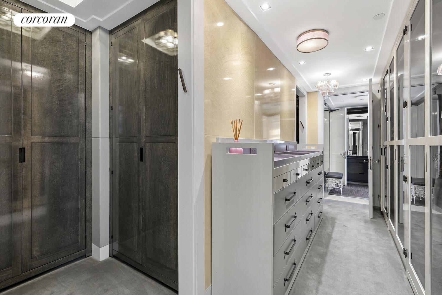 From your private elevator vestibule , enter a stately 30-foot gallery that introduces a home of grand scale and exceptional design. The 55-foot great room is bathed in natural light through five oversized north-facing windows and anchored by elegant proportions ideal for both formal entertaining and relaxed daily living. A corner library with gas fireplace and custom leather-wrapped millwork offers a quiet retreat of warmth and sophistication.