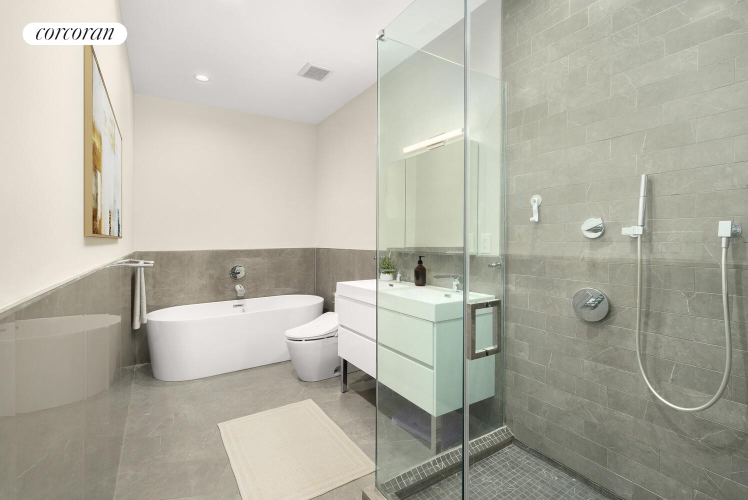 The upper floor hosts a serene primary suite with a decorative fireplace, a generous walk-in closet, and a spa-like bathroom with rain shower. Two additional large bedrooms share an elegantly designed full bath. All bathrooms are finished with top-of-the-line fixtures and materials.