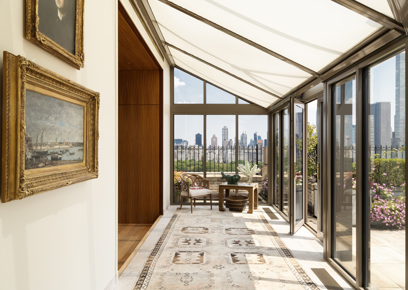 Ascend the elegant curved staircase to the 20th floor's double-height tower room with an incomparable wood-paneled library that features 14' ceilings, a wood burning fireplace and a wet bar. A dramatic solarium opens to a sprawling corner terrace with 3 exposures, including breathtaking views of Central Park and sunsets to the west - an unparalleled entertaining experience. This level also features a second powder room.