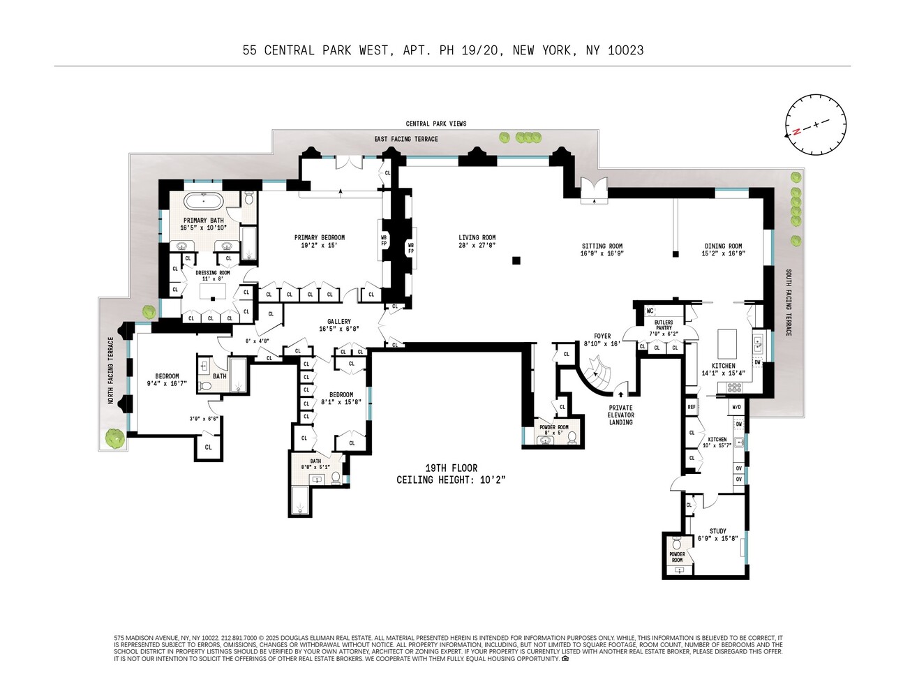 On the 19th floor entry level, a private elevator landing leads to the foyer, from which one is immediately struck by the home's grand proportions, 10'+ ceilings, and breathtaking views of Central Park from the open and loft-like entertaining rooms: a 28' x 28' living room with wood-burning fireplace, a sitting room, powder room and corner dining room with picturesque views of both Central Park and the city skyline. All the main rooms on the first level are encompassed by a vast terrace that is accessible from both the great room and primary bedroom.
