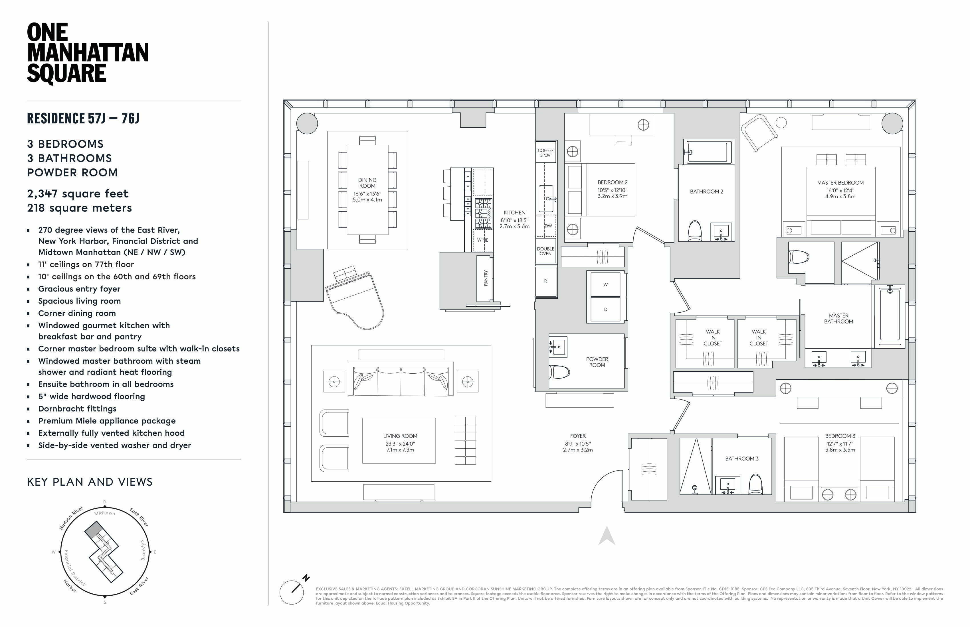• ONE MANHATTAN SQUARE OFFERS ONE OF THE LAST 20-YEAR TAX ABATEMENTS AVAILABLE IN NEW YORK CITY Sponsor Incentive: FOR A LIMITED-TIME ON ALL NEWLY SIGNED CONTRACTS AS OF APRIL 1, 2025, SPONSOR WILL PAY 4 YEARS OF COMMON CHARGES AND REAL ESTATE TAXES AS A CREDIT AGAINST THE PURCHASE PRICE. INCENTIVE IS ONLY VALID ON 2-AND 3-BEDROOMS Special Features: 11' Ceilings The Skyscape Collection, featuring Residence 77J, is a home in the sky. This generous 2,347 square foot triple exposure 3 bedroom, 3.5 bath residence is designed by Meyer Davis and features 270 degree views of the Lower East Waterfront, New York Harbor, Financial District and Midtown Manhattan. Astonishing panoramic views from South West and North West corner living room and dining room. Windowed gourmet kitchen with a breakfast bar, pantry closet, premium Miele and Subzero appliance package with a double oven plus speed oven, built-in whole-bean coffee system, integrated refrigerator, wine fridge, dishwasher and externally fully vented kitchen hood. Corner Master Bedroom suite with side-by-side walk-in closets, luxuriously appointed windowed 5 fixture ensuite bath with a steam shower, Wetstyle soaking bathtub with custom stone surround, radiant floor heating and a separate water closet. The second and third bedrooms are thoughtfully appointed with en-suite baths with imported stone and custom finishes. This residence comes equipped with a side-by-side, fully vented washer and dryer. A gorgeous powder room with a Boffi pedestal sink and Covelano marble polished stone accent wall and floors completes this magnificent home. New York's premier development company Extell, has collaborated with a team of world-class talent to create an icon that reflects the quality, choice and excellence that distinguish Extell properties- One Manhattan Square. Perfectly situated along the Lower East Side Waterfront, this 800-foot-tall striking glass tower offers one to three-bedroom condominium residences that feature epic river and skyline views and a lifestyle enhanced by over 100,000 square feet of indoor and outdoor amenities. One Manhattan Square presents the most valuable waterfront living opportunity in Manhattan with one of the last available 20-year tax abatement in New York City. Meyer Davis, the award-winning studio behind world-class hotels, elite private homes and flagship retail boutiques, has designed residences that rival five-star resorts. Each residence has been meticulously planned with gracious layouts, custom finishes and the most dynamic views. Residents can revel in the over 100,000 square feet of resort-like amenities that span three full floors of the tower and over 1-acre of private outdoor gardens. It all thrives on the Lower East Side. The transforming neighborhood is buzzing with energy and is within proximity of a number of landmarks including the South Street Seaport, Manhattan Bridge, and the East River Esplanade. One Manhattan Square was designed to appeal to those that want it all; iconic views, lush gardens, gorgeous homes, and an unprecedented package of services and amenities. IMMEDIATE OCCUPANCY SERVICES AND AMENITIES INCLUDE: Private motor court 24-Hour doorman and concierge White-glove services include package delivery, refrigerated storage, dry cleaning valet, and complimentary bicycle storage. Hammam with cold plunge pool 75' Saltwater indoor swimming pool Children's wading pool Spa treatment rooms Hot tub Sauna Full basketball court Two-lane bowling alley Squash court Golf simulator 42 Person movie theater and performance space Cellar bar and lounge Coworking space Wine storage and tasting room Cigar room Culinary lounge and demonstration kitchen Business center Game room Indoor children's playroom State-of-the-art weight room & cardio rooms Separate spin, yoga, Pilates and dance studios On-site parking garage available Pet spa, laundry, and alterations facilities Private storage available One Acre of Private Outdoor Amenities and Gardens include: Sumac meander Birch garden Social courtyards and relaxation lawns Fire pits Outdoor grills and dining Herb garden Treehouse Children's playground Tea pavilion Outdoor ping-pong Putting green Stargazing observatory 93' Covered dog run Managed by Extell Management Services *Incentive for new two- and three-bedroom contracts only. Not to be combined with any other incentives. Will be calculated based on 75% financing.