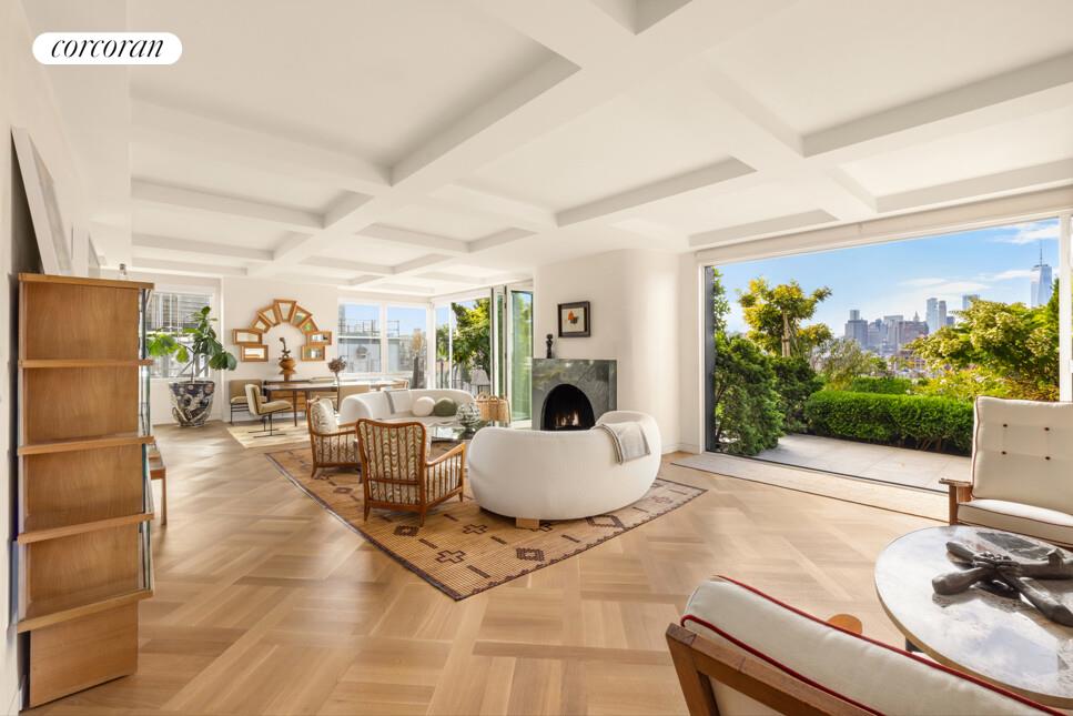 At the center of the home, a chef-caliber Vipp kitchen makes a bold statement with industrial elegance and refined functionality. Outfitted with Gaggenau appliances, a Miele double refrigerator, and a LanboPro wine fridge, it's the ideal setting for both casual meals and formal gatherings. Accordion-style NanaWall glass doors open seamlessly to the terrace, creating a private outdoor sanctuary for al fresco dining, entertaining, or simply enjoying the skyline.