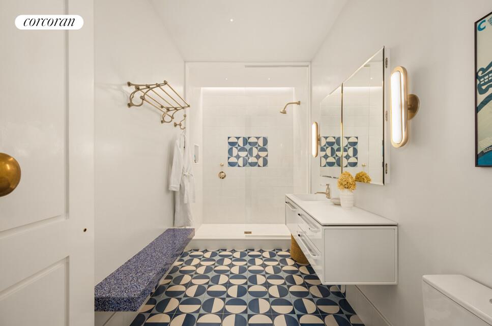 The primary suite offers a true retreat, featuring a spa-like bath adorned with bespoke marble, a mosaic tile floor, radiant heated floors, an oversized soaking tub, and Lefroy Brooks fixtures. An infrared sauna adds an unexpected touch of wellness-transforming daily routines into moments of restoration.