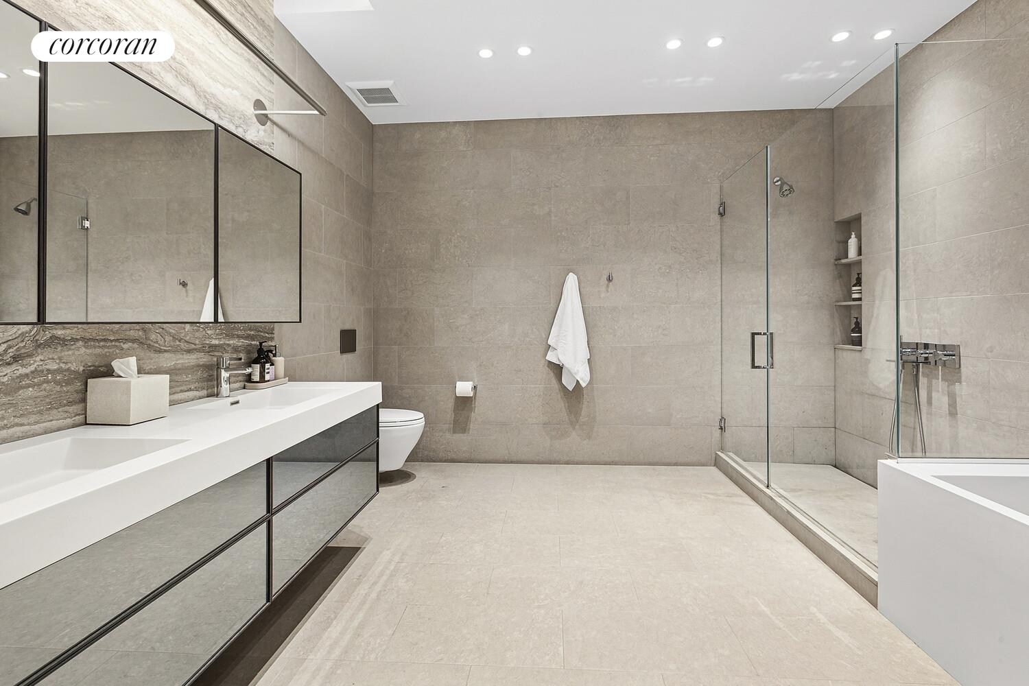 The serene primary suite occupies its own wing, complete with dual walk-in closets and a spa-quality bath wrapped in French limestone. An oversized soaking tub, generous walk-in shower, dual vanities, radiant heated floors, and premium Hansgrohe and WetStyle fixtures elevate the experience to everyday luxury and pure relaxation.