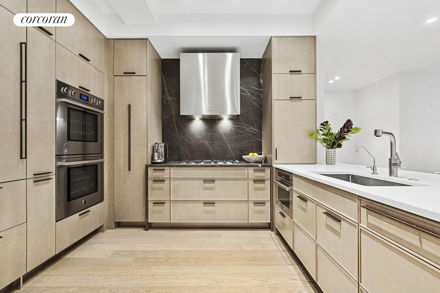 The open-concept living and dining area provides an exceptional setting for both entertaining and daily living. The chef's kitchen is as functional as it is beautiful, featuring custom European oak cabinetry, antique gray marble slab backsplashes, and high-end Sub-Zero and Bertazzoni appliances. Every detail is considered for seamless, modern living, from the spacious island to the elegant finishes that define the space.