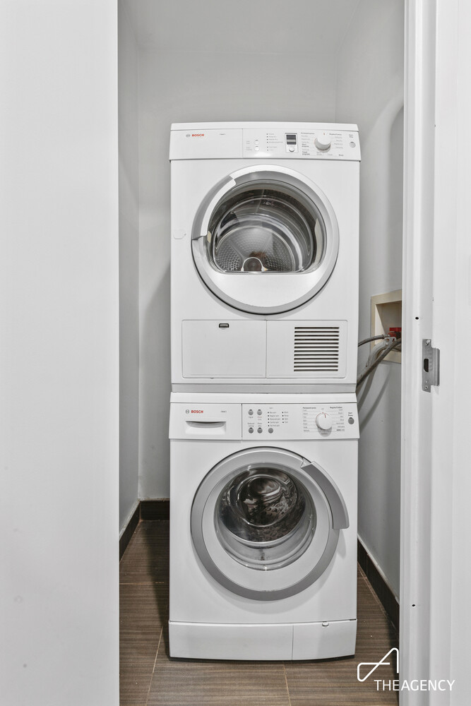 The bedroom comfortably accommodates a king-size bed along with additional furniture and offers generous closet space. The bathroom features quality finishes, and the home includes the convenience of an in-unit Bosch washer and dryer.