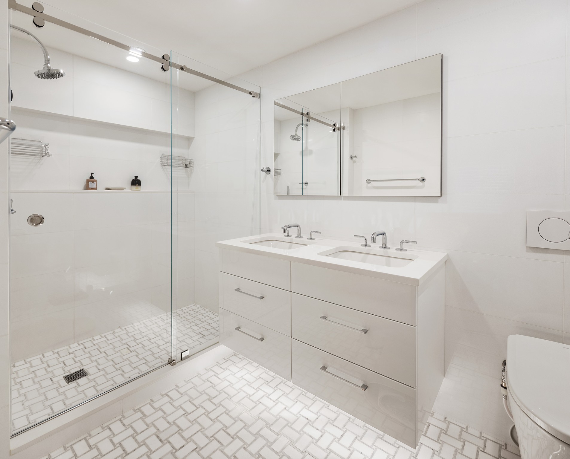 Primary En-Suite Bathroom featuring radiant heated flooring by Nuheat Nvent, Waterworks fixtures and TOTO Washlet toilet with integrated bidet functionality