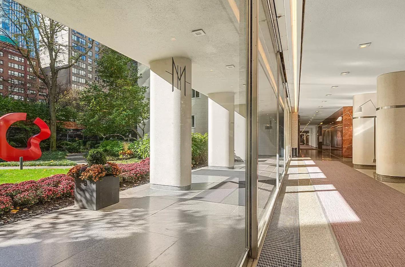 Grand, glass-enclosed lobby accessed via dual porte-cochre entrances, overlooking one of the largest gardens in NYC