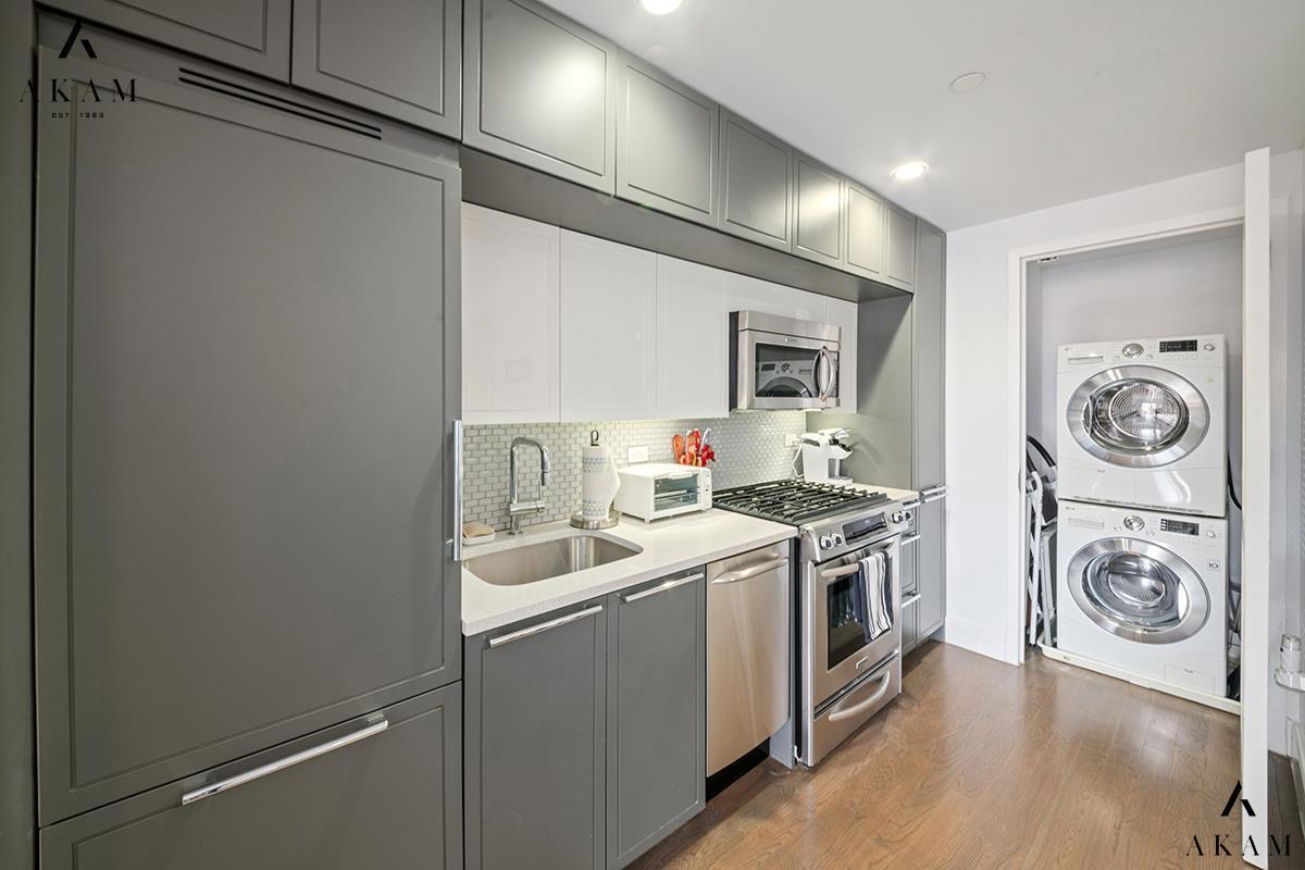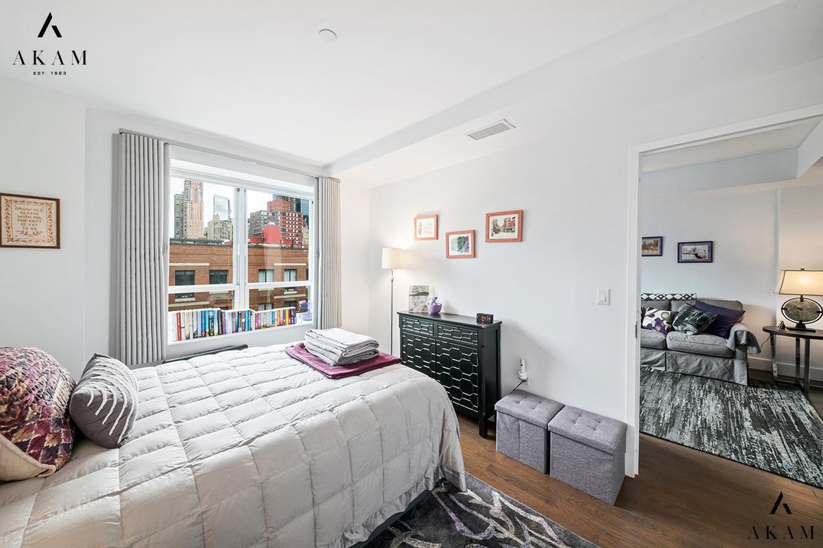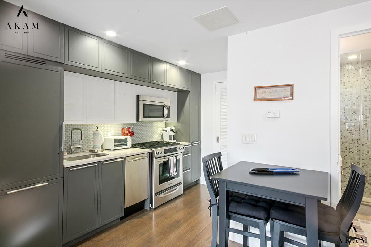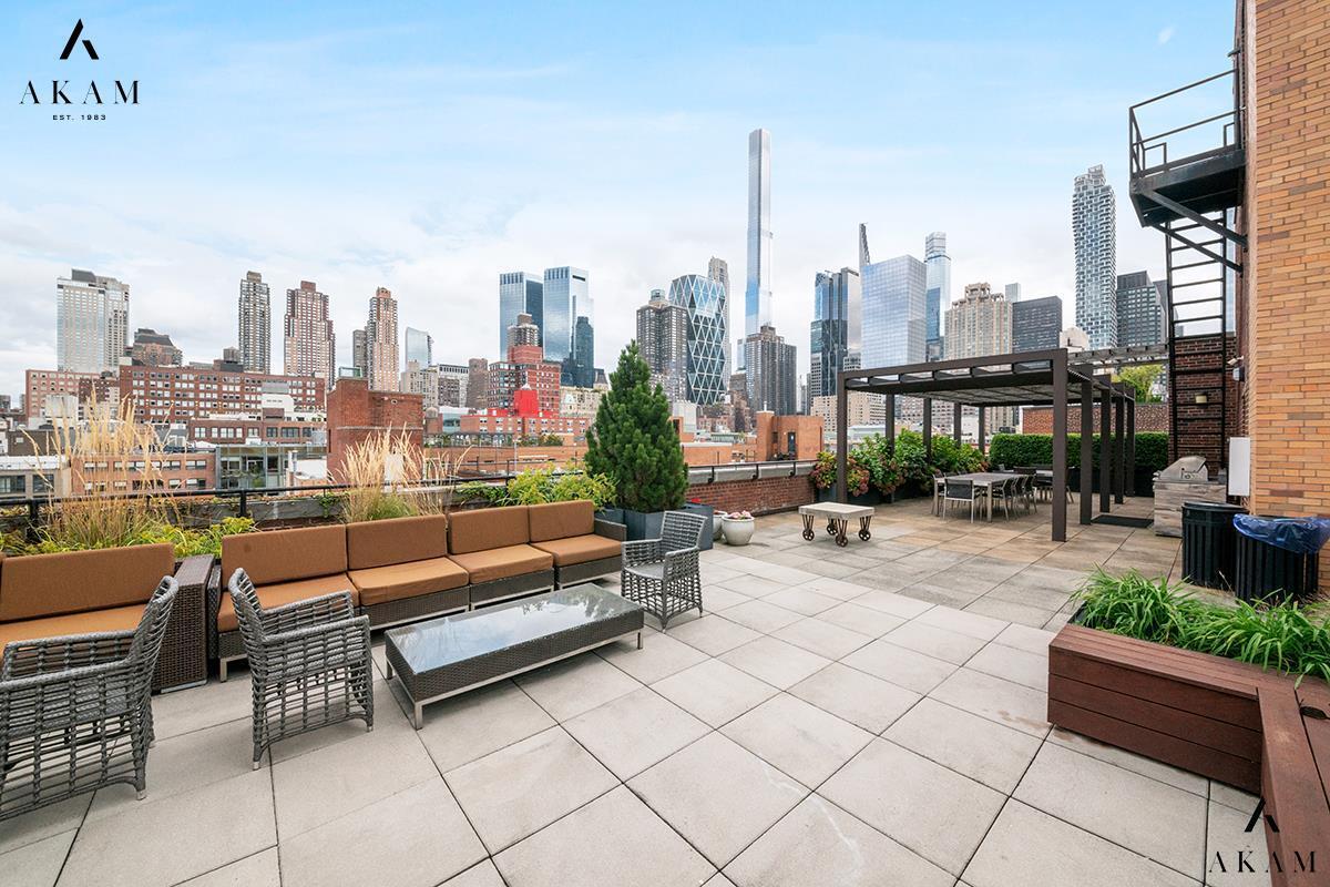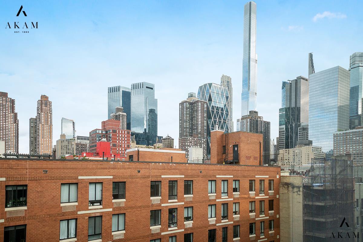 **Stunning Penthouse Corner Residence with Skyline Views | 1-Bedroom Condo in Hell's Kitchen** Priced to sell! Welcome to this fully renovated, top-floor penthouse condo offering breathtaking views of the New York City skyline. This spacious 1-bedroom corner residence combines luxury with comfort, featuring a bright and expansive living room, perfect for entertaining or relaxing. The home boasts high ceilings and elegant oak wood floors throughout, enhancing the sense of space and style. The open, renovated kitchen is a chef's dream, complete with Caesarstone countertops, stainless steel appliances (including a dishwasher), and an LG washer/dryer for added convenience. The bedroom offers privacy, comfort, great closet space and stunning skyline views. The expertly designed bathroom is a true retreat, with radiant heated floors and a sleek walk-in shower. Ample closet space, central AC and heat, and a proper entryway add to the thoughtful design and functionality of this exceptional home. 432 W 52nd Street is a premier boutique condominium located in the heart of Hell’s Kitchen, offering modern luxury and unparalleled convenience. Residents enjoy a beautifully landscaped 4,200 square-foot roof deck with stunning city views, perfect for relaxing or entertaining. The building also features a fully equipped fitness center, a stylish resident lounge for social gatherings, a secure bike room, and a doorman. Ideally situated within walking distance to Times Square/Theater District, Hudson River, Columbus Circle, and Central Park, 432 W 52nd Street offers the best of New York City at your doorstep with easy access to the A/C/E, B/D, 1, and N/Q/R subway lines.