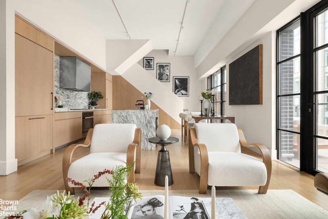 The Penthouse at 517 West 29th Street offers a rare combination of scale, design, and outdoor living, unfolding across a beautifully composed two-bedroom, two-bathroom duplex. With approximately 1,645 square feet of interior space and soaring 12-foot ceilings, this home has an airy, loft-like feel. Oversized windows capture sweeping skyline views and a direct vantage over the High Line. Two private terraces-totaling 685 square feet-create a seamless indoor-outdoor experience, ideal for entertaining or simply enjoying the city from above.