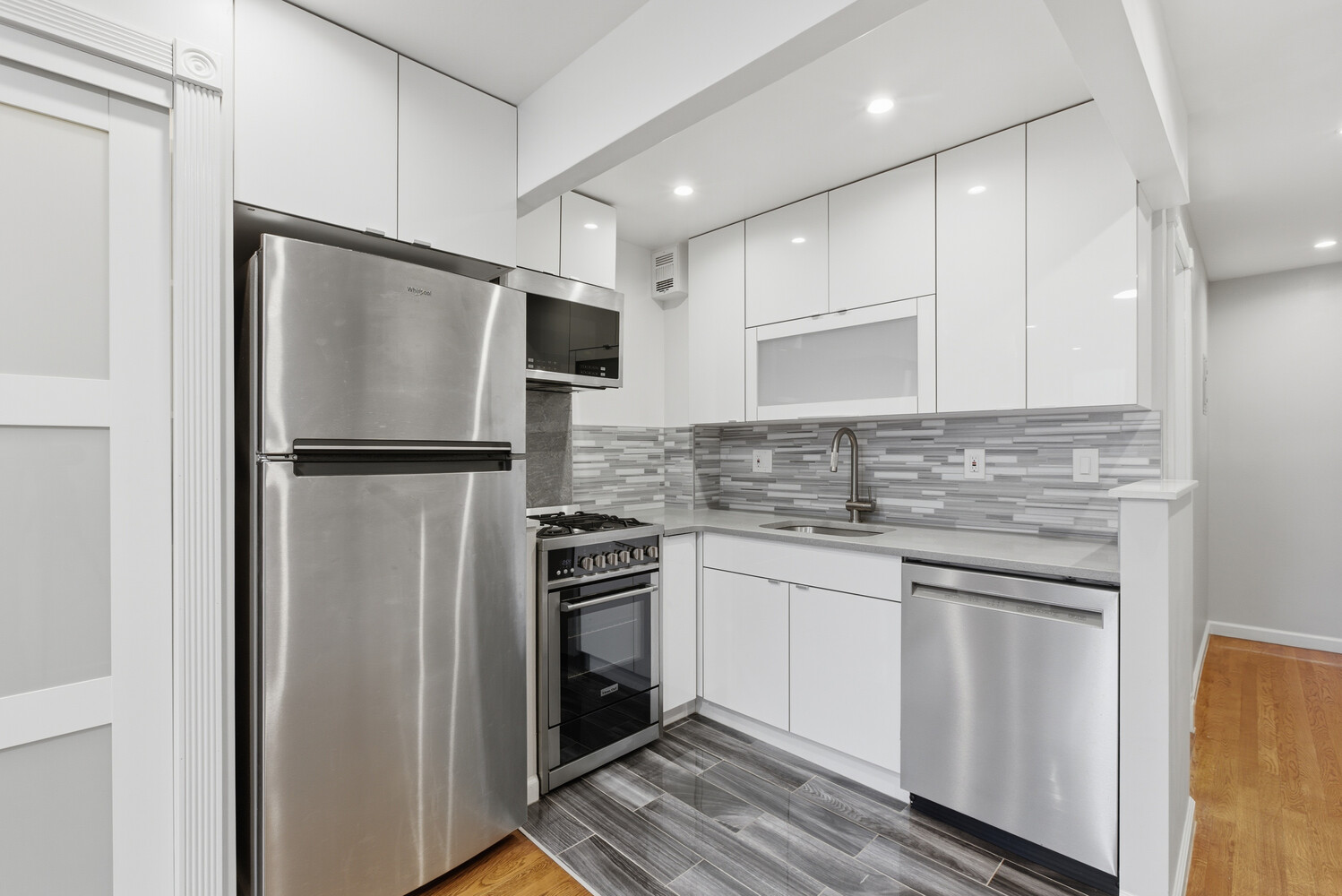 The sleek, modern kitchen is outfitted with quartz countertops and stainless steel appliances for both everyday living and entertaining. The spa-inspired bathroom has been completely renovated with elegant marble and tile finishes, a glass-enclosed shower and tub, and refined contemporary details. Storage is a standout feature, with three deep closets offering exceptional space rarely found in a studio for streamlined city living.