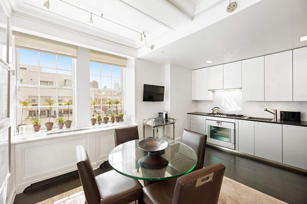 The windowed eat-in kitchen, designed by Piero Lissoni for Boffi, is outfitted with a full suite of top-tier appliances, including Sub-Zero, Gaggenau, and Miele, delivering both exceptional performance and timeless design.