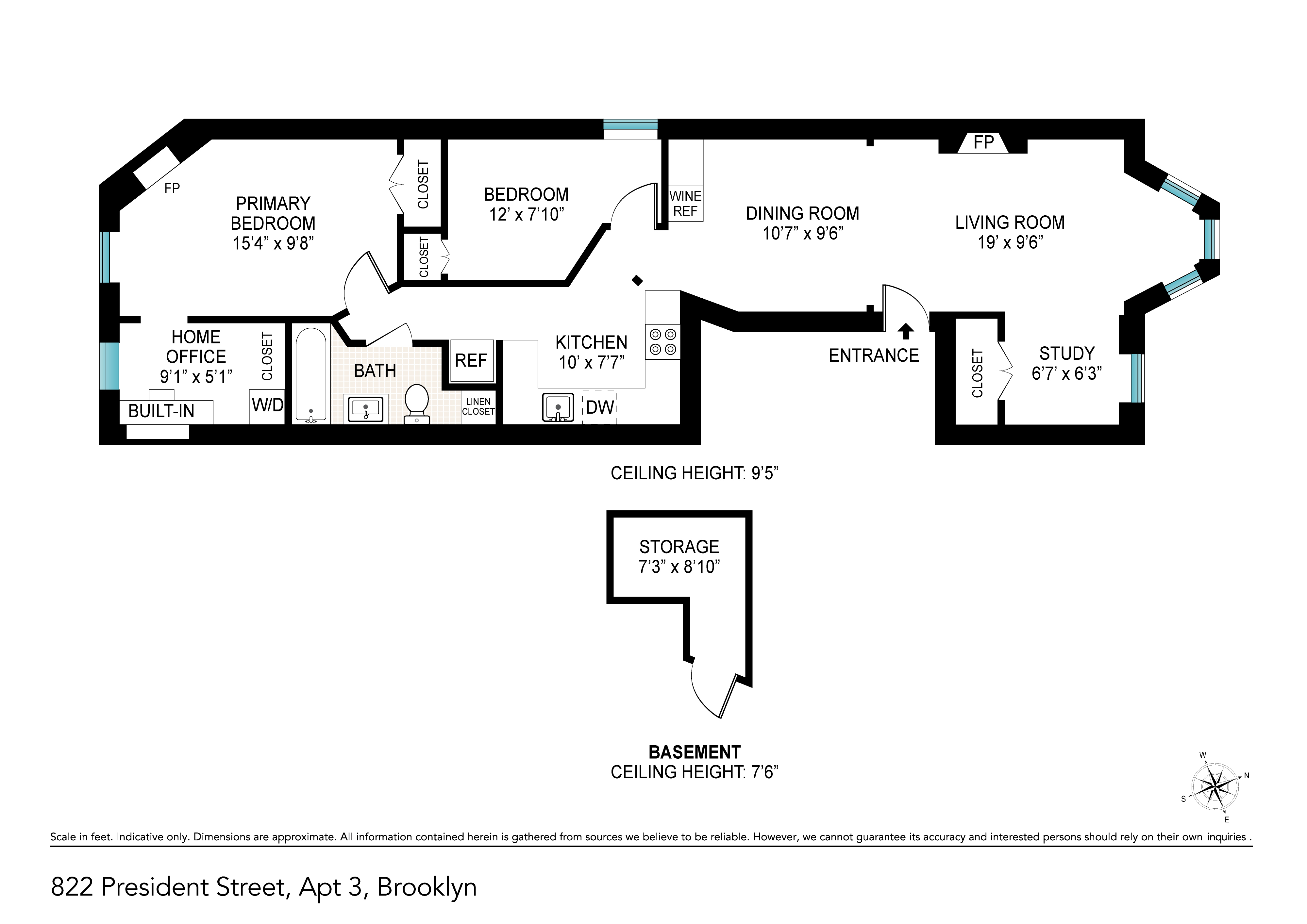 • Beautifully renovated turnkey two bedroom floor-through on a quiet, tree lined block in prime Park Slope. This home blends classic prewar details with thoughtful modern upgrades throughout. The sun-filled living room features a bay window, original fireplace, and rich hardwood floors. A separate dining area flows into a custom kitchen with white shaker cabinetry, quartz countertops, and a standout Ilve range. The primary bedroom has exposed brick, a Hearth Cabinet smokeless fireplace, brass sconces, motorized blinds, and exceptional storage — a walk-in closet and an additional closet, both with custom Elfa systems. The second bedroom is privately situated with ample storage. The bathroom features imported Italian shower tile, brass hardware, and heated floors. Additional highlights include in-unit laundry, dishwasher, a dedicated home office, and private keyed basement storage. Monthly maintenance is $810. Building upgrades include a new roof, hot water heater, exterior waterproofing, and brick repointing. A parking spot in a nearby private lot can potentially transfer. Two blocks to Prospect Park. Five minutes from the B/Q and 2/3 trains. Within two blocks: gym, daycare, food co-op, grocery, coffee, and more. Self managed four unit co-op, pets on approval.