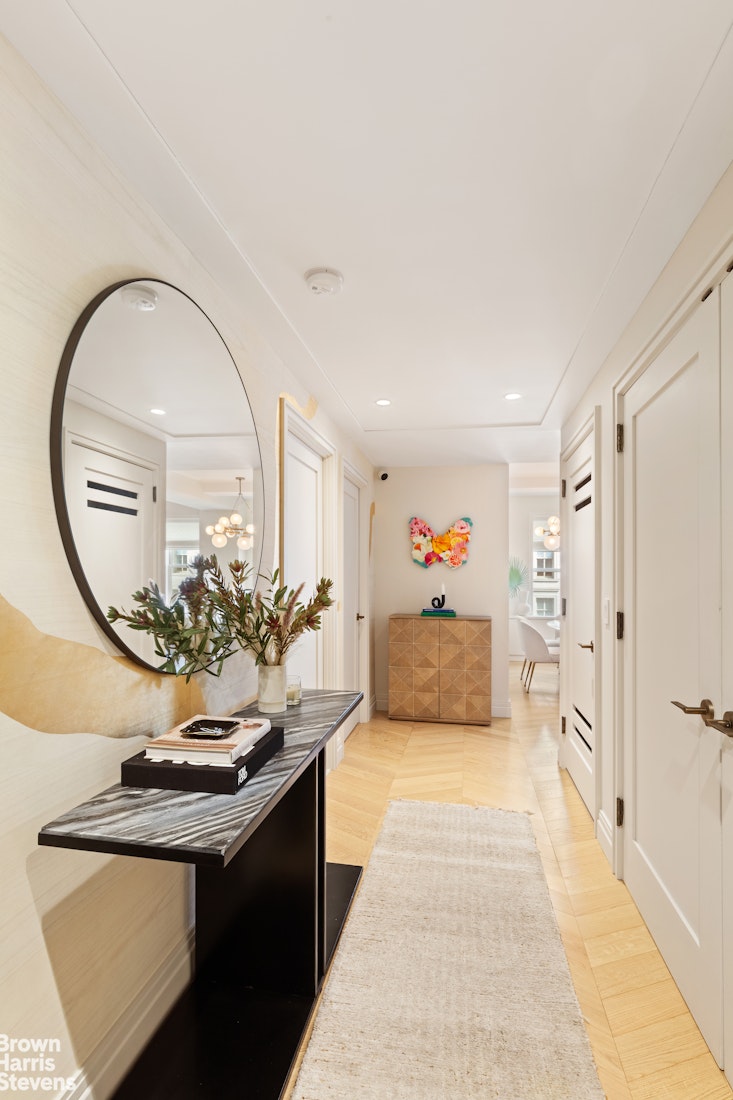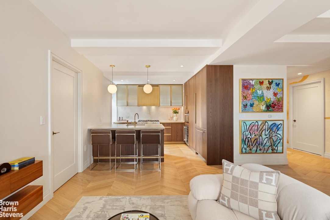 The entry foyer opens to a generous living and dining area flooded with morning light, with white oak chevron floors throughout. The open kitchen is outfitted with custom fluted glass and American walnut cabinetry, Naica Quartzite countertops and backsplash with a leathered finish, a full Miele appliance suite, and an InSinkErator garbage disposal. The corner primary bedroom suite occupies its own wing with a large walk-in closet and a luxurious en-suite bath finished in honed Pacific White Marble, featuring a custom white lacquer dual-vanity with Calacatta Black Marble countertop, a frameless glass walk-in shower, and heated floors. The secondary bath is finished with Corduroy Deco glazed ceramic wall tiles and Calacatta Gold Marble mosaic floors.